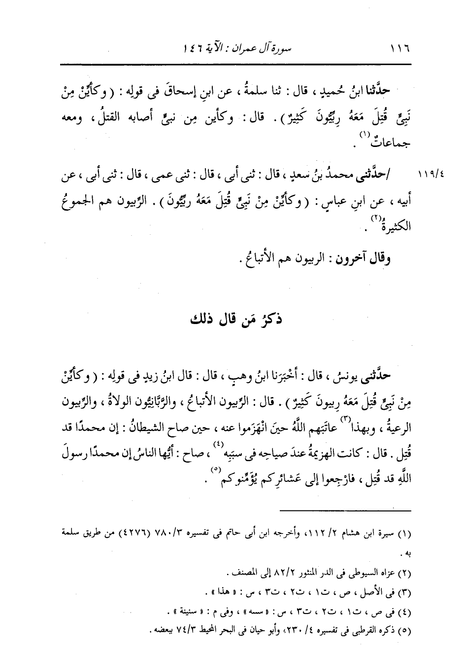 حَدَّثَنَا ابْنُ حُمَيْدٍ، قَالَ: ثنا سَلَمَةُ، عَنِ ابْنِ إِسْحَاقَ، قَوْلُهُ: (§وَكَأَيِّنْ مِنْ نَبِيٍّ قُتِلَ مَعَهُ رِبِّيُّونَ كَثِيرٌ) قَالَ: «وَكَأَيِّنْ مِنْ نَبِيٍّ أَصَابَهُ الْقَتْلُ، وَمَعَهُ جَمَاعَاتٌ»
