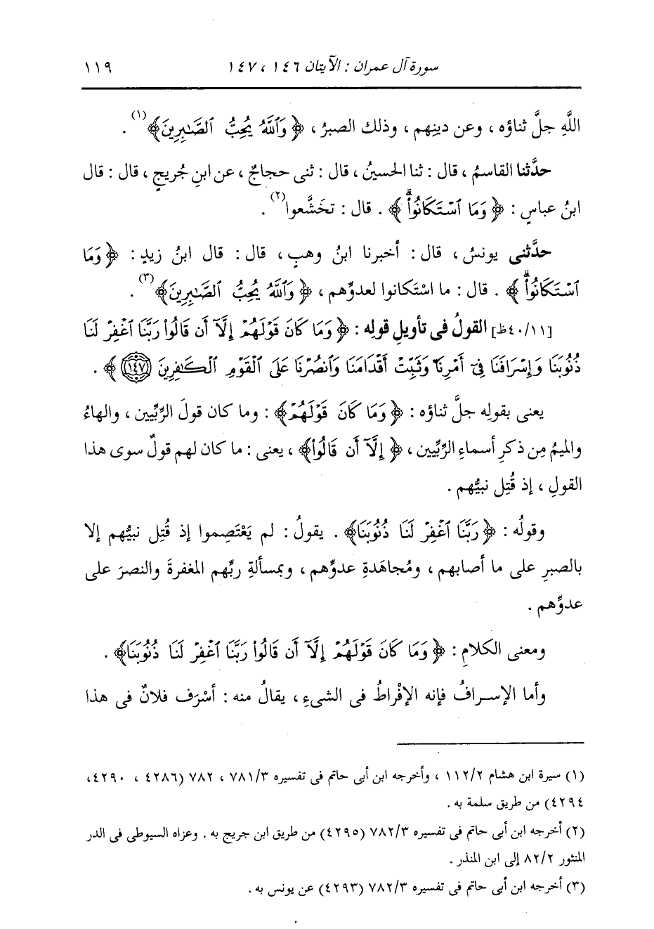 §الْقَوْلُ فِي تَأْوِيلِ قَوْلِهِ تَعَالَى: {وَمَا كَانَ قَوْلَهُمْ إِلَّا أَنْ قَالُوا رَبَّنَا اغْفِرْ لَنَا ذُنُوبَنَا وَإِسْرَافَنَا فِي أَمْرِنَا وَثَبِّتْ أَقْدَامَنَا وَانْصُرْنَا عَلَى الْقَوْمِ الْكَافِرِينَ} [آل عمران: 147] يَعْنِي تَعَالَى ذِكْرُهُ بِقَوْلِهِ: {وَمَا كَانَ قَوْلَهُمْ} [آل عمران: 147] وَمَا كَانَ قَوْلَ الرِّبِّيِّينَ، وَالْهَاءُ وَالْمِيمُ مِنْ ذِكْرِ أَسْمَاءِ الرِّبِّيِّينَ {إِلَّا أَنْ قَالُوا} [آل عمران: 147] يَعْنِي مَا كَانَ لَهُمْ قَوْلٌ سِوَى هَذَا الْقَوْلِ إِذْ قُتِلَ نَبِيُّهُمْ. وَقَوْلُهُ: {رَبَّنَا اغْفِرْ لَنَا ذُنُوبَنَا} [آل عمران: 147] يَقُولُ: " لَمْ يَعْتَصِمُوا إِذْ قُتِلَ نَبِيُّهُمْ إِلَّا بِالصَّبِرِ عَلَى مَا أَصَابَهُمْ، وَمُجَاهَدَةِ عَدُوِّهِمْ، وَبِمَسْأَلَةِ رَبِّهِمُ الْمَغْفِرَةَ وَالنَّصْرَ عَلَى عَدُوِّهِمْ، وَمَعْنَى الْكَلَامِ: {وَمَا كَانَ قَوْلَهُمْ إِلَّا أَنْ قَالُوا رَبَّنَا اغْفِرْ لَنَا ذُنُوبَنَا} [آل عمران: 147] وَأَمَّا الْإِسْرَافُ: فَإِنَّهُ الْإِفْرَاطُ فِي الشَّيْءِ، يُقَالُ مِنْهُ: أَسْرَفَ فُلَانٌ فِي هَذَا