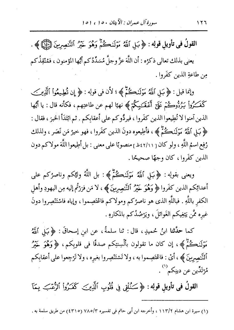 §الْقَوْلُ فِي تَأْوِيلِ قَوْلِهِ تَعَالَى: {بَلْ اللَّهُ مَوْلَاكُمْ وَهُوَ خَيْرُ النَّاصِرِينَ} [آل عمران: 150] يَعْنِي بِذَلِكَ تَعَالَى ذِكْرُهُ أَنَّ اللَّهَ مُسَدِّدُكُمْ أَيُّهَا الْمُؤْمِنُونَ، فَمُنْقِذُكُمْ مِنْ طَاعَةِ الَّذِينَ كَفَرُوا. وَإِنَّمَا قِيلَ: {بَلْ اللَّهُ مَوْلَاكُمْ} [آل عمران: 150] لِأَنَّ قَوْلَهُ: {إِنْ تُطِيعُوا الَّذِينَ كَفَرُوا يَرُدُّوكُمْ عَلَى أَعْقَابِكُمْ} [آل عمران: 149] نَهْي لَهُمْ عَنْ طَاعَتِهِمْ، فَكَأَنَّهُ قَالَ: يَا أَيُّهَا الَّذِينَ آمَنُوا لَا تُطِيعُوا الَّذِينَ كَفَرُوا، فَيَرُدُّوكُمْ عَلَى أَعْقَابِكُمْ، ثُمَّ ابْتَدَأَ الْخَبَرَ، فَقَالَ: {بَلِ اللَّهُ مَوْلَاكُمْ} [آل عمران: 150] فَأَطِيعِوهُ دُونَ الَّذِينَ كَفَرُوا فَهُوَ خَيْرٌ مِنْ نَصْرٍ، وَلِذَلِكَ رُفِعَ اسْمُ اللَّهِ، وَلَوْ كَانَ مَنْصُوبًا عَلَى مَعْنَى: بَلْ أَطِيعُوا اللَّهَ مَوْلَاكُمْ دُونَ الَّذِينَ كَفَرُوا، كَانَ وَجْهًا صَحِيحًا. وَيَعْنِي بِقَوْلِهِ: {بَلِ اللَّهُ مَوْلَاكُمْ} [آل عمران: 150] وَلِيُّكُمْ وَنَاصِرُكُمْ عَلَى أَعْدَائِكُمُ الَّذِينَ كَفَرُوا، {وَهُوَ خَيْرُ النَّاصِرِينَ} [آل عمران: 150] لَا مَنْ فَرَرْتُمْ إِلَيْهِ مِنَ الْيَهُودِ وَأَهْلِ الْكُفْرِ بِاللَّهِ، فَبِاللَّهِ الَّذِي هُوَ نَاصِرُكُمْ وَمَوْلَاكُمْ فَاعْتَصِمُوا وَإِيَّاهُ فَاسْتَنْصِرُوا دُونَ غَيْرِهِ مِمَّنْ يَبْغِيكُمُ الْغَوَائِلَ وَيَرْصُدُكُمْ بِالْمَكَارِهِ