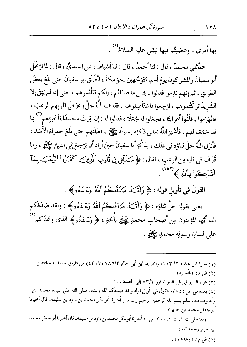 حَدَّثَنِي مُحَمَّدُ بْنُ الْحُسَيْنِ، قَالَ: ثنا أَحْمَدُ، قَالَ: ثنا أَسْبَاطٌ، عَنِ السُّدِّيِّ، قَالَ: " §لَمَّا ارْتَحَلَ أَبُو سُفْيَانَ وَالْمُشْرِكُونَ يَوْمَ أُحُدٍ مُتَوَجِّهِينَ نَحْوَ مَكَّةَ، انْطَلَقَ أَبُو سُفْيَانَ حَتَّى بَلَغَ بَعْضَ الطَّرِيقِ، ثُمَّ إِنَّهُمْ نَدِمُوا فَقَالُوا: بِئْسَ مَا صَنَعْتُمْ، إِنَّكُمْ قَتَلْتُمُوهُمْ، حَتَّى إِذَا لَمْ يَبْقَ إِلَّا الشِّرِّيرُ تَرَكْتُمُوهُمُ، ارْجِعُوا فَاسْتَأْصِلُوهُمْ، فَقَذَفَ اللَّهُ عَزَّ وَجَلَّ فِي قُلُوبِهِمُ الرُّعْبَ، فَانْهَزَمُوا، فَلَقُوا أَعْرَابِيًّا، فَجَعَلُوا لَهُ جُعْلًا، وَقَالُوا لَهُ: إِنْ لَقِيتَ مُحَمَّدًا فَأَخْبِرْهُ بِمَا قَدْ جَمَعْنَا لَهُمْ فَأَخْبَرَ اللَّهُ عَزَّ وَجَلَّ رَسُولَهُ صَلَّى اللهُ عَلَيْهِ وَسَلَّمَ، فَطَلَبَهُمْ حَتَّى بَلَغَ حَمْرَاءَ الْأَسَدِ، فَأَنْزَلَ اللَّهُ عَزَّ وَجَلَّ فِي ذَلِكَ، فَذَكَرَ أَبَا سُفْيَانَ حِينَ أَرَادَ أَنْ يَرْجِعَ إِلَى النَّبِيِّ صَلَّى اللهُ عَلَيْهِ وَسَلَّمَ وَمَا قَذَفَ فِي قَلْبِهِ مِنَ الرُّعْبِ، فَقَالَ: {سَنُلْقِي فِي قُلُوبِ الَّذِينَ كَفَرُوا الرُّعْبَ بِمَا أَشْرَكُوا بِاللَّهِ} [آل عمران: 151] "