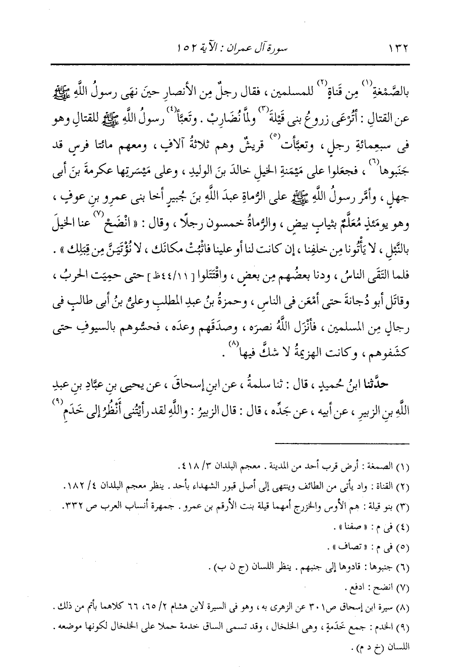 بِالصَّمْغَةِ مِنْ قَنَاةٍ لِلْمُسْلِمِينَ، فَقَالَ رَجُلٌ مِنَ الْأَنْصَارِ حِينَ نَهَى رَسُولُ اللَّهِ صَلَّى اللهُ عَلَيْهِ وَسَلَّمَ عَنِ الْقِتَالِ: أَتُرْعَى زُرُوعُ بَنِي قَيْلَةَ وَلَمَّا نُضَارِبْ؟ وَصَفَّنَا رَسُولُ اللَّهِ صَلَّى اللهُ عَلَيْهِ وَسَلَّمَ لِلْقِتَالِ، وَهُوَ فِي سَبْعِمِائَةِ رَجُلٍ، وَتَصَافَّ قُرَيْشٌ وَهُمْ ثَلَاثَةُ آلَافٍ، وَمَعَهُمْ مِائَتَا فَرَسٍ قَدْ جَنَّبُوهَا، فَجَعَلُوا عَلَى مَيْمَنَةِ الْخَيْلِ خَالِدَ بْنَ الْوَلِيدِ، وَعَلَى مَيْسَرَتِهَا عِكْرِمَةَ بْنَ أَبِي جَهْلٍ، وَأَمَّرَ رَسُولُ اللَّهِ صَلَّى اللهُ عَلَيْهِ وَسَلَّمَ عَلَى الرُّمَاةِ عَبْدَ اللَّهِ بْنَ جُبَيْرٍ أَخَا بَنِي عَمْرِو بْنِ عَوْفٍ، وَهُوَ يَوْمَئِذٍ مُعَلَّمٌ بِثِيَابٍ بِيضٍ، وَالرُّمَاةُ خَمْسُونَ رَجُلًا، وَقَالَ: «انْضَحْ عَنَّا الْخَيْلَ بِالنَّبْلِ لَا يَأْتُونَا مِنْ خَلْفِنَا إِنْ كَانَتْ لَنَا أَوْ عَلَيْنَا فَاثْبُتْ مَكَانَكَ، لَا نُؤْتَيَنَّ مِنْ قِبَلِكَ» فَلَمَّا الْتَقَى النَّاسُ، وَدَنَا بَعْضُهُمْ مِنْ بَعْضٍ، وَاقْتَتَلُوا حَتَّى حَمَيَتِ الْحَرْبُ، وَقَاتِلُ أَبُو دُجَانَةَ حَتَّى أَمْعَنَ فِي النَّاسِ، وَحَمْزَةُ بْنُ عَبْدِ الْمُطَّلِبِ، وَعَلِيُّ بْنُ أَبَى طَالِبٍ فِي رِجَالٍ مِنَ الْمُسْلِمِينَ، فَأَنْزَلَ اللَّهُ عَزَّ وَجَلَّ نَصَرَهُ، وَصَدَقَهُمْ وَعْدَهُ، فَحَسُّوهُمْ بِالسُّيُوفِ حَتَّى كَشَفُوهُمْ، وَكَانَتِ الْهَزِيمَةُ لَا شَكَّ فِيهَا "