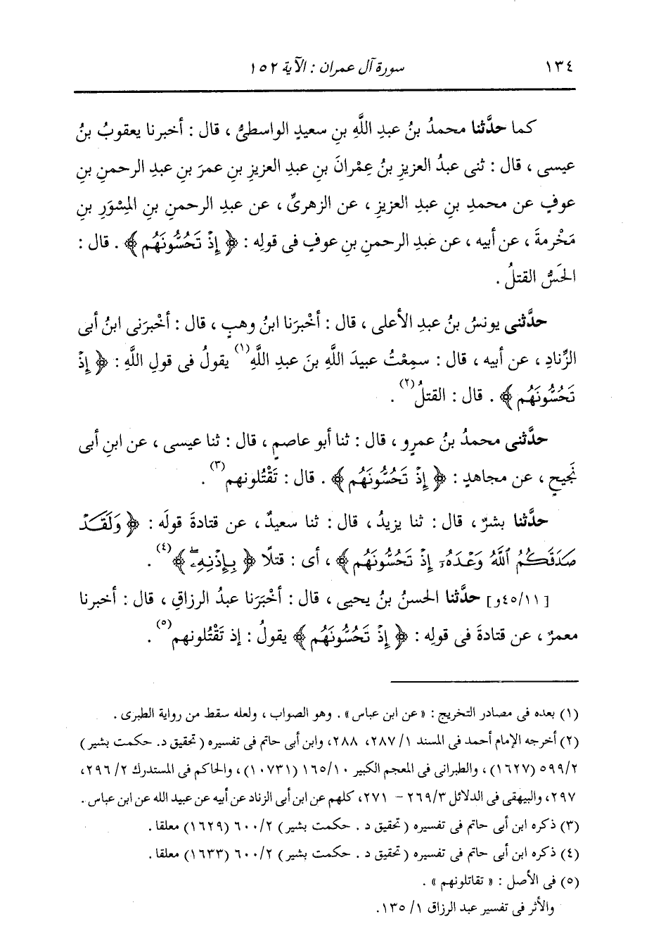 كَمَا: حَدَّثَنِي مُحَمَّدُ بْنُ عَبْدِ اللَّهِ بْنِ سَعِيدٍ الْوَاسِطِيُّ، قَالَ: ثنا يَعْقُوبُ بْنُ عِيسَى، قَالَ: ثني عَبْدُ الْعَزِيزِ بْنُ عِمْرَانَ بْنِ عَبْدِ الْعَزِيزِ بْنِ عُمَرَ بْنِ عَبْدِ الرَّحْمَنِ بْنِ عَوْفٍ، عَنْ مُحَمَّدِ بْنِ عَبْدِ الْعَزِيزِ، عَنِ الزُّهْرِيِّ، عَنْ عَبْدِ الرَّحْمَنِ بْنِ الْمِسْوَرِ بْنِ مَخْرَمَةَ، عَنْ أَبِيهِ، عَنْ عَبْدِ الرَّحْمَنِ بْنِ عَوْفٍ، فِي قَوْلِهِ: {§إِذْ تَحُسُّونَهُمْ بِإِذْنِهِ} [آل عمران: 152] قَالَ: " الْحَسُّ: الْقَتْلُ "