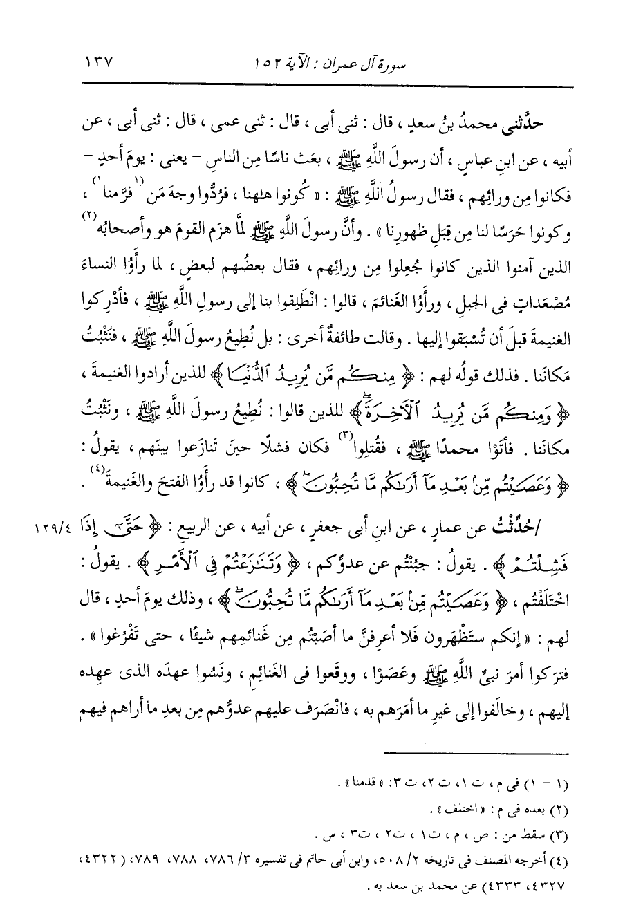 حَدَّثَنِي مُحَمَّدُ بْنُ سَعْدٍ، قَالَ: ثني أَبِي، قَالَ: ثني عَمِّي، قَالَ: ثني أَبِي، عَنْ أَبِيهِ، عَنِ ابْنِ عَبَّاسٍ، أَنَّ رَسُولَ اللَّهِ صَلَّى اللهُ عَلَيْهِ وَسَلَّمَ بَعَثَ نَاسًا مِنَ النَّاسِ - يَعْنِي: يَوْمَ أُحُدٍ - فَكَانُوا مِنْ وَرَائِهِمْ، فَقَالَ رَسُولُ اللَّهِ صَلَّى اللهُ عَلَيْهِ وَسَلَّمَ: «كُونُوا هَاهُنَا فَرُدُّوا وَجْهَ مَنْ قَدِمَنَا، وَكُونُوا حَرَسًا لَنَا مِنْ قِبَلِ ظُهُورِنَا» وَأَنَّ رَسُولَ اللَّهِ صَلَّى اللهُ عَلَيْهِ وَسَلَّمَ لَمَّا هَزَمَ الْقَوْمَ هُوَ وَأَصْحَابُهُ، اخْتَلَفَ الَّذِينَ كَانُوا جُعِلُوا مِنْ وَرَائِهِمْ، فَقَالَ بَعْضُهُمْ لِبَعْضٍ لَمَّا رَأَوُا النِّسَاءَ مُصْعِدَاتٍ فِي الْجَبَلِ، وَرَأَوُا الْغَنَائِمَ، قَالُوا: انْطَلِقُوا إِلَى رَسُولِ اللَّهِ صَلَّى فَأَدْرِكُوا الْغَنِيمَةَ قَبْلَ أَنْ تُسْبَقُوا إِلَيْهَا، وَقَالَتْ طَائِفَةٌ أُخْرَى: بَلْ نُطِيعُ رَسُولَ اللَّهِ صَلَّى اللهُ عَلَيْهِ وَسَلَّمَ فَنَثْبُتُ مَكَانَنَا " فَذَلِكَ قَوْلُهُ: {§مِنْكُمْ مَنْ يُرِيدُ الدُّنْيَا} [آل عمران: 152] «لِلَّذِينَ أَرَادُوا الْغَنِيمَةَ» {وَمِنْكُمْ مَنْ يُرِيدُ الْآخِرَةَ} [آل عمران: 152] لِلَّذِينَ قَالُوا: " نُطِيعُ رَسُولَ اللَّهِ وَنَثْبُتُ مَكَانَنَا، فَأَتَوْا مُحَمَّدًا صَلَّى اللهُ عَلَيْهِ وَسَلَّمَ فَكَانَ فَشَلًا حِينَ تَنَازَعُوا بَيْنَهُمْ؛ يَقُولُ: {وَعَصَيْتُمْ مِنْ بَعْدِ مَا أَرَاكُمْ مَا تُحِبُّونَ} [آل عمران: 152] «كَانُوا قَدْ رَأَوُا الْفَتْحَ وَالْغَنِيمَةَ»