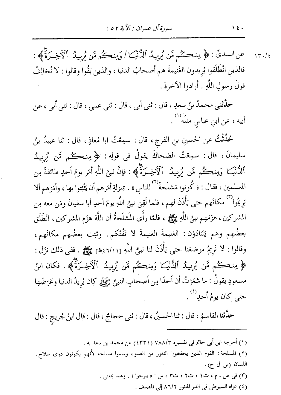 حَدَّثَنَا الْقَاسِمُ، قَالَ: ثنا الْحُسَيْنُ، قَالَ: ثني حَجَّاجٌ، قَالَ: قَالَ ابْنُ جُرَيْجٍ: قَالَ -[141]- ابْنُ عَبَّاسٍ: " §لَمَّا هَزَمَ اللَّهُ الْمُشْرِكِينَ يَوْمَ أُحُدٍ، قَالَ الرُّمَاةُ: أَدْرِكُوا النَّاسَ وَنَبِيَّ اللَّهِ صَلَّى اللهُ عَلَيْهِ وَسَلَّمَ لَا يَسْبِقُوكُمْ إِلَى الْغَنَائِمِ فَتَكُونَ لَهُمْ دُونَكُمْ، وَقَالَ بَعْضُهُمْ: لَا نُرِيمُ حَتَّى يَأْذَنَ لَنَا النَّبِيُّ صَلَّى اللهُ عَلَيْهِ وَسَلَّمَ، فَنَزَلَتْ: {مِنْكُمْ مَنْ يُرِيدُ الدُّنْيَا وَمِنْكُمْ مَنْ يُرِيدُ الْآخِرَةَ} [آل عمران: 152] "