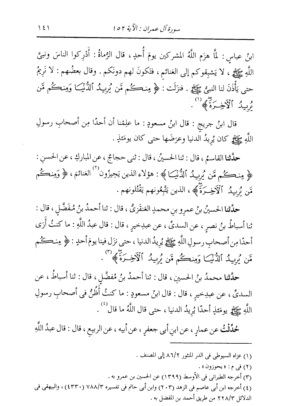 حَدَّثَنَا الْحُسَيْنُ بْنُ عَمْرِو بْنِ مُحَمَّدٍ الْعَنْقَزِيُّ، قَالَ: ثنا أَحْمَدُ بْنُ الْمُفَضَّلِ، قَالَ: ثنا أَسْبَاطٌ، عَنِ السُّدِّيِّ، عَنْ عَبْدِ خَيْرٍ، قَالَ: قَالَ عَبْدُ اللَّهِ: «مَا كُنْتُ أَرَى أَحَدًا مِنْ أَصْحَابِ رَسُولِ اللَّهِ صَلَّى اللهُ عَلَيْهِ وَسَلَّمَ يُرِيدُ الدُّنْيَا، حَتَّى نَزَلَ فِينَا يَوْمَ أُحُدٍ» : {§مِنْكُمْ مَنْ يُرِيدُ الدُّنْيَا وَمِنْكُمْ مَنْ يُرِيدُ الْآخِرَةَ} [آل عمران: 152]