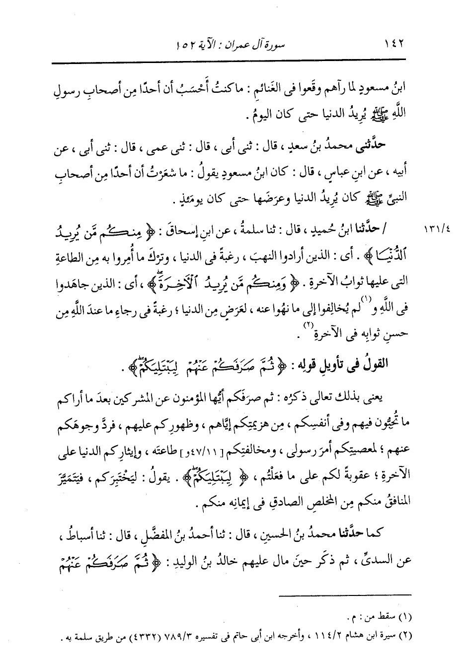 حَدَّثَنَا ابْنُ حُمَيْدٍ، قَالَ: ثنا سَلَمَةُ، عَنِ ابْنِ إِسْحَاقَ، {§مِنْكُمْ مَنْ يُرِيدُ الدُّنْيَا} [آل عمران: 152] «أَيِ الَّذِينَ أَرَادُوا النَّهْبَ رَغْبَةً فِي الدُّنْيَا وَتَرَكَ مَا أُمِرُوا بِهِ مِنَ الطَّاعَةِ الَّتِي عَلَيْهَا ثَوَابُ الْآخِرَةِ» {وَمِنْكُمْ مَنْ يُرِيدُ الْآخِرَةَ} [آل عمران: 152] «أَيِ الَّذِينَ جَاهَدُوا فِي اللَّهِ لَمْ يُخَالِفُوا إِلَى مَا نُهُوا عَنْهُ لِعَرَضٍ مِنَ الدُّنْيَا رَغْبَةً فِي رَجَاءِ مَا عِنْدَ اللَّهِ مِنْ حُسْنِ ثَوَابِهِ فِي الْآخِرَةِ»