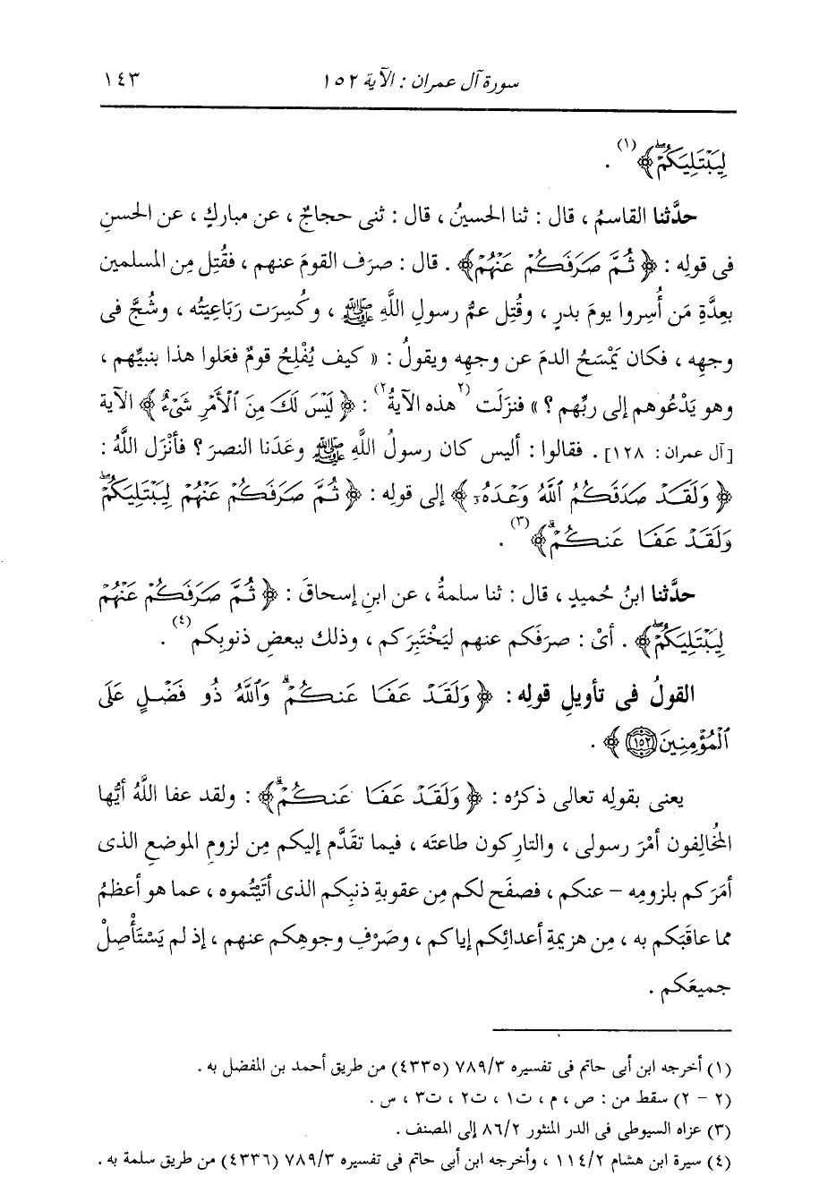 حَدَّثَنَا الْقَاسِمُ، قَالَ: ثنا الْحُسَيْنُ، قَالَ: ثني حَجَّاجٌ، عَنْ مُبَارَكٍ، عَنِ الْحَسَنِ، فِي قَوْلِهِ: {§ثُمَّ صَرَفَكُمْ عَنْهُمْ} [آل عمران: 152] قَالَ: " صَرَفَ الْقَوْمَ عَنْهُمْ، فَقُتِلَ مِنَ الْمُسْلِمِينَ بِعِدَّةِ مَنْ أُسِرُوا يَوْمَ بَدْرٍ، وَقُتِلَ عَمُّ رَسُولِ اللَّهِ صَلَّى اللهُ عَلَيْهِ وَسَلَّمَ، وَكُسِرَتْ رُبَاعِيَتُهُ، وَشُجَّ فِي وَجْهِهِ، وَكَانَ يَمْسَحُ الدَّمَ عَنْ وَجْهِهِ، وَيَقُولُ: «كَيْفَ يُفْلِحُ قَوْمٌ فَعَلُوا هَذَا بِنَبِيِّهِمْ وَهُوَ يَدْعُوهُمْ إِلَى رَبِّهِمْ؟» ؛ فَنَزَلَتْ: {لَيْسَ لَكَ مِنَ الْأَمْرِ شَيْءٌ} [آل عمران: 128] الْآيَةَ، فَقَالُوا: أَلَيْسَ كَانَ رَسُولُ اللَّهِ صَلَّى اللهُ عَلَيْهِ وَسَلَّمَ وَعَدَنَا النَّصْرَ؟ فَأَنْزَلَ اللَّهُ عَزَّ وَجَلَّ: {وَلَقَدْ صَدَقَكُمُ اللَّهُ وَعْدَهُ} [آل عمران: 152] إِلَى قَوْلِهِ: {ثُمَّ صَرَفَكُمْ عَنْهُمْ لِيَبْتَلِيَكُمْ وَلَقَدْ عَفَا عَنْكُمْ} [آل عمران: 152]