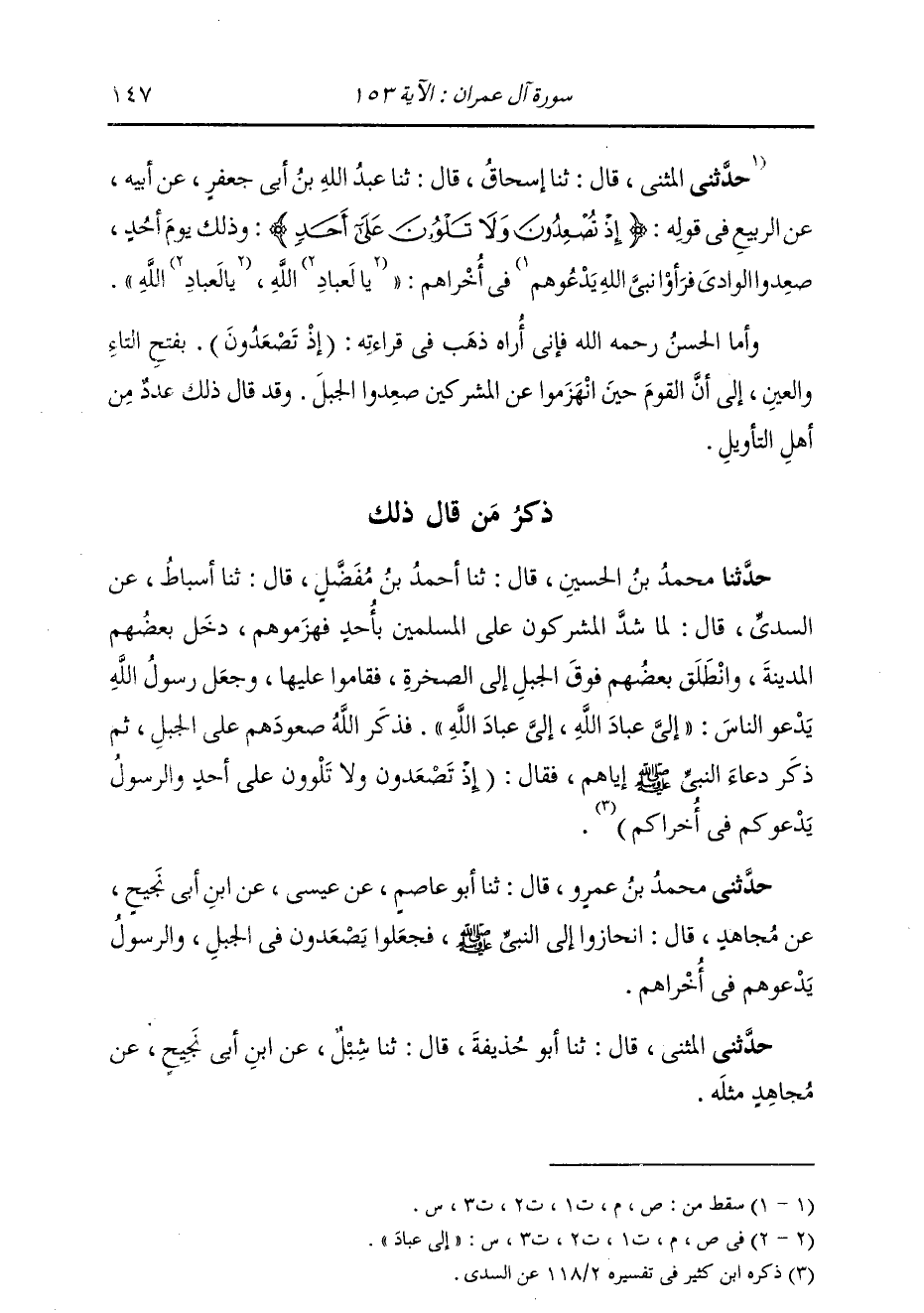 حَدَّثَنِي مُحَمَّدُ بْنُ عَمْرٍو، قَالَ: ثنا أَبُو عَاصِمٍ، عَنْ عِيسَى، عَنِ ابْنِ أَبِي نَجِيحٍ، عَنْ مُجَاهِدٍ، قَالَ: «§انْحَازُوا إِلَى النَّبِيِّ صَلَّى اللهُ عَلَيْهِ وَسَلَّمَ، فَجَعَلُوا يَصْعَدُونَ فِي الْجَبَلِ، وَالرَّسُولُ يَدْعُوهُمْ فِي أُخْرَاهُمْ» حَدَّثَنِي الْمُثَنَّى، قَالَ: ثنا أَبُو حُذَيْفَةَ، قَالَ: ثنا شِبْلٌ، عَنِ ابْنِ أَبِي نَجِيحٍ، عَنْ مُجَاهِدٍ، مِثْلَهُ