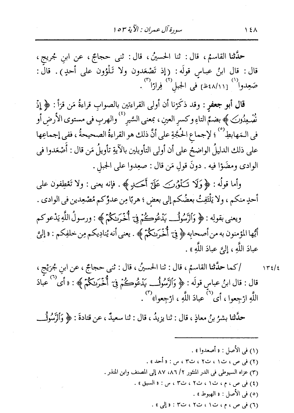 حَدَّثَنَا الْقَاسِمُ، قَالَ: ثنا الْحُسَيْنُ، قَالَ: ثني حَجَّاجٌ، عَنِ ابْنِ جُرَيْجٍ، قَالَ: قَالَ ابْنُ عَبَّاسٍ، قَوْلُهُ: {§إِذْ تُصْعِدُونَ وَلَا تَلْوُونَ عَلَى أَحَدٍ} [آل عمران: 153] قَالَ: «صَعِدُوا فِي أُحُدٍ فِرَارًا» قَالَ أَبُو جَعْفَرٍ: وَقَدْ ذَكَرْنَا أَنَّ أَوْلَى الْقِرَاءَتَيْنِ بِالصَّوَابِ قِرَاءَةُ مَنْ قَرَأَ: {إِذْ تُصْعِدُونَ} [آل عمران: 153] بِضَمِّ التَّاءِ وَكَسْرِ الْعَيْنِ، بِمَعْنَى السَّبَقِ وَالْهَرَبِ فِي مُسْتَوَى الْأَرْضِ، أَوْ فِي الْمَهَابِطِ، لِإِجْمَاعِ الْحُجَّةِ عَلَى أَنَّ ذَلِكَ هُوَ الْقِرَاءَةُ الصَّحِيحَةُ، فَفِي إِجْمَاعِهَا عَلَى ذَلِكَ الدَّلِيلُ الْوَاضِحُ عَلَى أَنَّ أَوْلَى التَّأْوِيلَيْنِ بِالْآيَةِ تَأْوِيلُ مَنْ قَالَ: أَصْعَدُوا فِي الْوَادِي، وَمَضَوْا فِيهِ، دُونَ قَوْلِ مَنْ قَالَ: صَعِدُوا عَلَى الْجَبَلِ. وَأَمَّا قَوْلُهُ: {وَلَا تَلْوُونَ عَلَى أَحَدٍ} [آل عمران: 153] فَإِنَّهُ يَعْنِي: وَلَا تَعْطِفُونَ عَلَى أَحَدٍ مِنْكُمْ، وَلَا يَلْتَفِتْ بَعْضُكُمْ إِلَى بَعْضٍ هَرَبًا مِنْ عَدُوِّكُمْ مُصْعِدِينَ فِي الْوَادِي. وَيَعْنِي بِقَوْلِهِ: {وَالرَّسُولُ يَدْعُوكُمْ فِي أُخْرَاكُمْ} [آل عمران: 153] وَرَسُولُ اللَّهِ صَلَّى اللهُ عَلَيْهِ وَسَلَّمَ يَدْعُوكُمْ أَيُّهَا الْمُؤْمِنُونَ بِهِ مِنْ أَصْحَابِهِ فِي أُخْرَاكُمْ، يَعْنِي أَنَّهُ يُنَادِيكُمْ مِنْ خَلْفِكُمْ: «إِلَيَّ عِبَادَ اللَّهِ، إِلَيَّ عِبَادَ اللَّهِ»