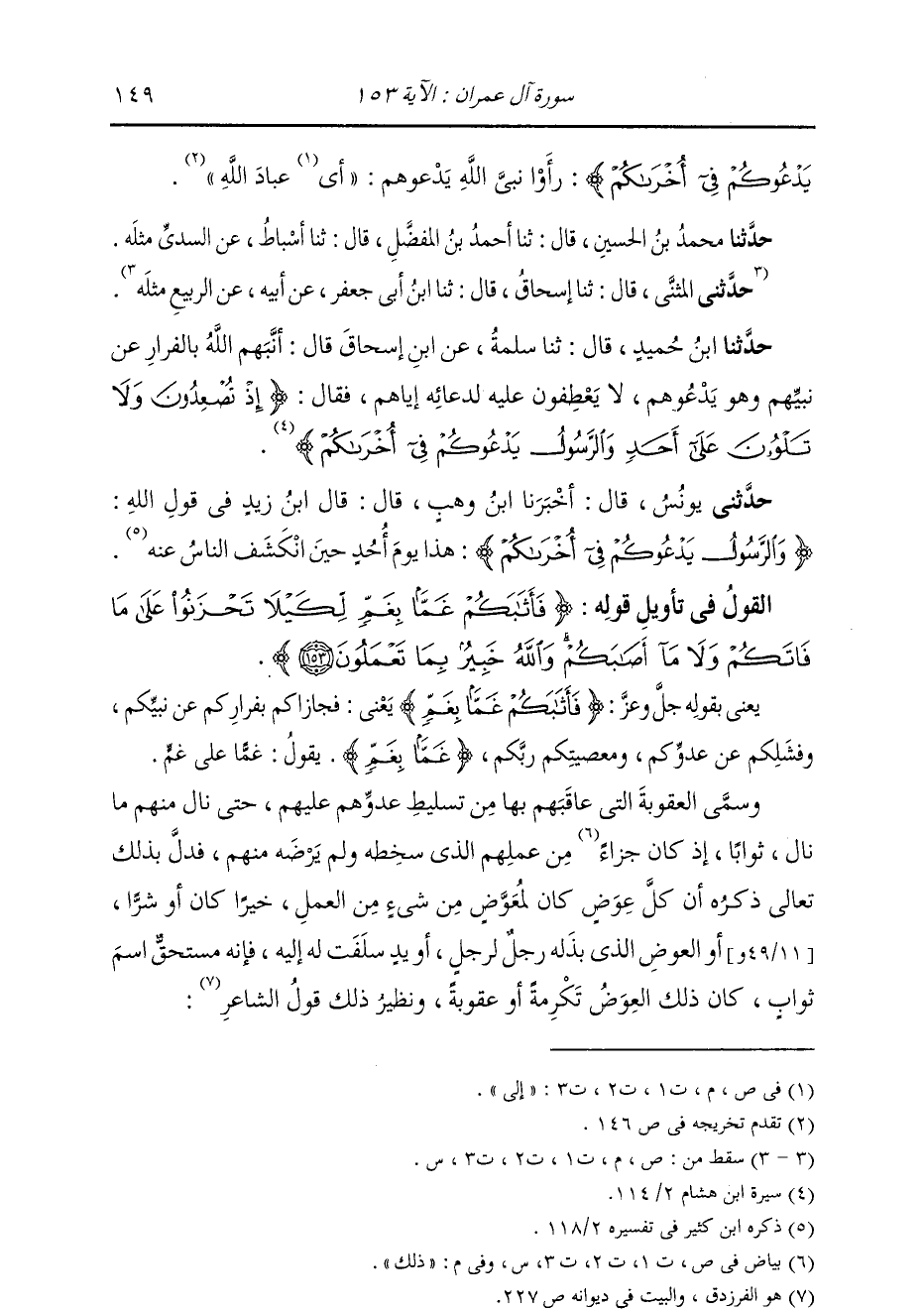 §الْقَوْلُ فِي تَأْوِيلِ قَوْلِهِ تَعَالَى: {فَأَثَابَكُمْ غَمًّا بِغَمٍّ لِكَيْلَا تَحْزَنُوا عَلَى مَا فَاتَكُمْ وَلَا مَا أَصَابَكُمْ وَاللَّهُ خَبِيرٌ بِمَا تَعْمَلُونَ} [آل عمران: 153] يَعْنِي بِقَوْلِهِ جَلَّ ثناؤُهُ: {فَأَثَابَكُمْ غَمًّا بِغَمٍّ} [آل عمران: 153] يَعْنِي: فَجَازَاكُمْ بِفِرَارِكُمْ عَنْ نَبِيِّكُمْ، وَفَشَلِكُمْ عَنْ عَدُوِّكُمْ، وَمَعْصِيَتِكُمْ رَبَّكُمْ غَمًّا بِغَمٍّ، يَقُولُ: غَمًّا عَلَى غَمٍّ. وَسَمَّى الْعُقُوبَةَ الَّتِي عَاقَبَهُمْ بِهَا مِنْ تَسْلِيطِ عَدُوِّهِمْ عَلَيْهِمْ حَتَّى نَالَ مِنْهُمْ مَا نَالَ ثَوَابًا، إِذْ كَانَ ذَلِكَ مِنْ عَمَلِهِمُ الَّذِي سَخَطِهِ وَلَمْ يَرْضَهُ مِنْهُمْ، فَدَلَّ بِذَلِكَ جَلَّ ثناؤُهُ أَنَّ كُلَّ عِوَضٍ كَالْمُعَوَّضِ مِنْ شَيْءٍ مِنَ الْعَمَلِ، خَيْرًا كَانَ أَوْ شَرًّا، أَوِ الْعِوَضُ الَّذِي بَذَلَهُ رَجُلٌ لِرَجُلٍ أَوْ يَدٌ سَلَفَتْ لَهُ إِلَيْهِ، فَإِنَّهُ مُسْتَحِقٌّ اسْمَ ثَوَابٍ كَانَ ذَلِكَ الْعِوَضُ تَكْرِمَةٌ أَوْ عُقُوبَةً، وَنَظِيرُ ذَلِكَ قَوْلُ الشَّاعِرِ: