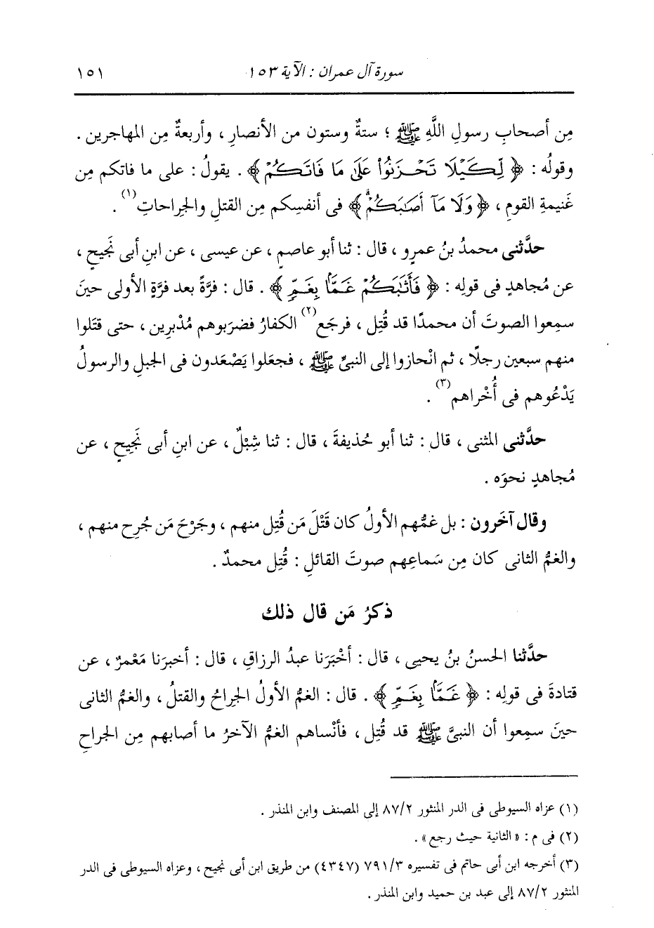 حَدَّثَنِي مُحَمَّدُ بْنُ عَمْرٍو، قَالَ: ثنا أَبُو عَاصِمٍ، عَنْ عِيسَى، عَنِ ابْنِ أَبِي نَجِيحٍ، عَنْ مُجَاهِدٍ، فِي قَوْلِهِ: {§فَأَثَابَكُمْ غَمًّا بِغَمٍّ} [آل عمران: 153] قَالَ: " فَرَّةً بَعْدَ فَرَّةٍ، الْأُولَى: حِينَ سَمِعُوا الصَّوْتَ أَنَّ مُحَمَّدًا قَدْ قُتِلَ؛ وَالثَّانِيَةُ: حِينَ رَجَعَ الْكُفَّارُ فَضَرَبُوهُمْ مُدْبِرِينَ، حَتَّى قَتَلُوا مِنْهُمْ سَبْعِينَ رَجُلًا، ثُمَّ انْحَازُوا إِلَى النَّبِيِّ صَلَّى اللهُ عَلَيْهِ وَسَلَّمَ، فَجَعَلُوا يُصْعِدُونَ فِي الْجَبَلِ، وَالرَّسُولُ يَدْعُوهُمْ فِي أُخْرَاهُمْ " حَدَّثَنِي الْمُثَنَّى، قَالَ: ثنا أَبُو حُذَيْفَةَ، قَالَ: ثنا شِبْلٌ، عَنِ ابْنِ أَبِي نَجِيحٍ، عَنْ مُجَاهِدٍ، نَحْوَهُ. وَقَالَ آخَرُونَ: بَلْ غَمُّهُمُ الْأَوَّلُ كَانَ قَتْلَ مَنْ قُتِلَ مِنْهُمْ، وَجَرْحَ مَنْ جُرِحَ مِنْهُمْ، وَالْغَمُّ الثَّانِي كَانَ مِنْ سَمَاعِهِمْ صَوْتَ الْقَائِلِ: قُتِلَ مُحَمَّدٌ صَلَّى اللهُ عَلَيْهِ وَسَلَّمَ