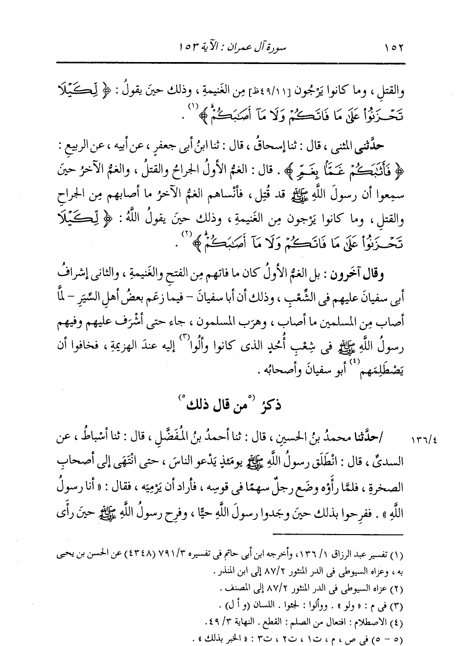 حَدَّثَنِي الْمُثَنَّى، قَالَ: ثنا إِسْحَاقُ، قَالَ: ثنا عَبْدُ اللَّهِ بْنُ أَبِي جَعْفَرٍ، عَنْ أَبِيهِ، عَنِ الرَّبِيعِ: {§فَأَثَابَكُمْ غَمًّا بِغَمٍّ} [آل عمران: 153] قَالَ: «الْغَمُّ الْأَوَّلُ الْجِرَاحُ وَالْقَتْلُ؛ وَالْغَمُّ الْآخَرُ حِينَ سَمِعُوا أَنَّ رَسُولَ اللَّهِ صَلَّى اللهُ عَلَيْهِ وَسَلَّمَ قَدْ قُتِلَ، فَأَنْسَاهُمُ الْغَمُّ الْآخَرُ مَا أَصَابَهُمْ مِنَ الْجِرَاحِ وَالْقَتْلِ، وَمَا كَانُوا يَرْجُونَ مِنَ الْغَنِيمَةِ» وَذَلِكَ حِينَ يَقُولُ اللَّهُ: {لِكَيْلَا تَحْزَنُوا عَلَى مَا فَاتَكُمْ وَلَا مَا أَصَابَكُمْ} [آل عمران: 153] وَقَالَ آخَرُونَ: بَلِ الْغَمُّ الْأَوَّلُ مَا كَانَ فَاتَهُمْ مِنَ الْفَتْحِ وَالْغَنِيمَةِ؛ وَالثَّانِي إِشْرَافُ أَبِي سُفْيَانَ عَلَيْهِمْ فِي الشِّعْبِ، وَذَلِكَ أَنَّ أَبَا سُفْيَانَ فِيمَا زَعَمَ بَعْضُ أَهْلِ السِّيَرِ لَمَّا أَصَابَ مِنَ الْمُسْلِمِينَ مَا أَصَابَ، وَهَرَبَ الْمُسْلِمُونَ، جَاءَ حَتَّى أَشْرَفَ عَلَيْهِمْ وَفِيهِمْ رَسُولُ اللَّهِ صَلَّى اللهُ عَلَيْهِ وَسَلَّمَ فِي شِعْبٍ أُحُدٍ الَّذِي كَانُوا وَلَّوْا إِلَيْهِ عِنْدَ الْهَزِيمَةِ، فَخَافُوا أَنْ يَصْطَلِمَهُمْ أَبُو سُفْيَانَ وَأَصْحَابُهُ