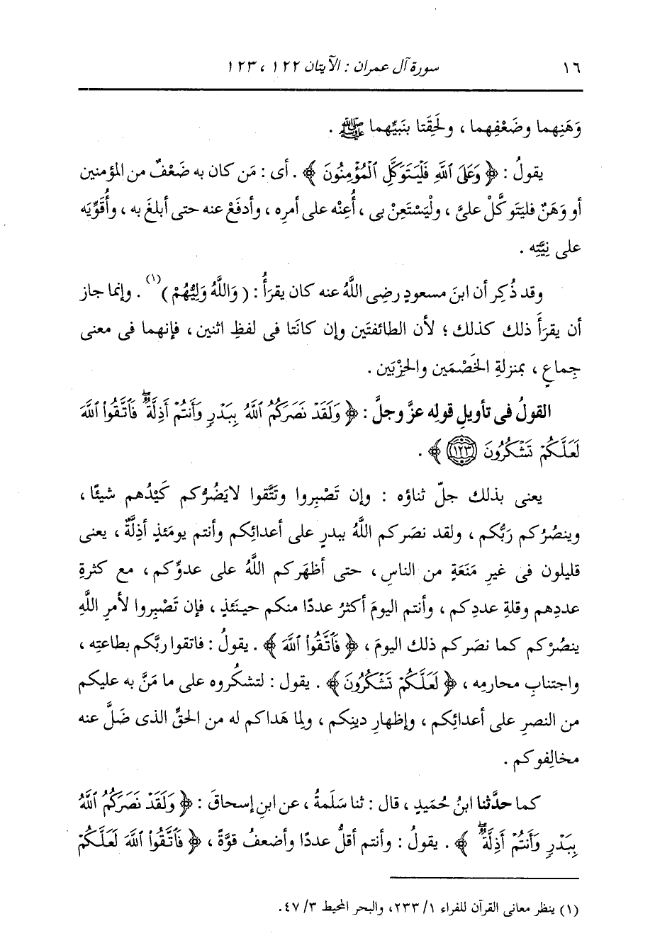 §الْقَوْلُ فِي تَأْوِيلِ قَوْلِهِ تَعَالَى: {وَلَقَدْ نَصَرَكُمُ اللَّهُ بِبَدْرٍ وَأَنْتُمْ أَذِلَّةٌ فَاتَّقُوا اللَّهَ لَعَلَّكُمْ تَشْكُرُونَ} [آل عمران: 123] يَعْنِي بِذَلِكَ جَلَّ ثناؤُهُ: وَإِنْ تَصْبِرُوا وَتَتَّقُوا، لَا يَضُرَّكُمْ كَيْدُهُمْ شَيْئًا، وَيَنْصُرْكُمْ رَبُّكُمْ، {وَلَقَدْ نَصَرَكُمُ اللَّهُ بِبَدْرٍ} [آل عمران: 123] عَلَى أَعْدَائِكُمْ {وَأَنْتُمْ} [البقرة: 22] يَوْمَئِذٍ {أَذِلَّةٌ} [آل عمران: 123] يَعْنِي قَلِيلُونَ، فِي غَيْرِ مَنَعَةٍ مِنَ النَّاسِ، حَتَّى أَظْهَرَكُمُ اللَّهُ عَلَى عَدُوِّكُمْ مَعَ كَثْرَةِ عَدَدِهِمْ، وَقِلَّةِ عَدَدِكُمْ، وَأَنْتُمْ الْيَوْمَ أَكْثَرُ عَدَدًا مِنْكُمْ حِينَئِذٍ، فَإِنْ تَصْبِرُوا لِأَمْرِ اللَّهِ يَنْصُرْكُمْ كَمَا نَصَرَكُمْ ذَلِكَ الْيَوْمَ {فَاتَّقُوا اللَّهَ} [آل عمران: 50] يَقُولُ تَعَالَى ذِكْرُهُ: فَاتَّقُوا رَبَّكُمْ بِطَاعَتِهِ وَاجْتِنَابِ مَحَارِمِهِ {لَعَلَّكُمْ تَشْكُرُونَ} [البقرة: 52] يَقُولُ: لِتَشْكُرُوهُ عَلَى مَا مَنَّ بِهِ عَلَيْكُمْ مِنَ النَّصْرِ عَلَى أَعْدَائِكُمْ، وَإِظْهَارِ دِينِكُمْ، وَلِمَا هَدَاكُمْ لَهُ مِنَ الْحَقِّ الَّذِي ضَلَّ عَنْهُ مُخَالِفُوكُمْ