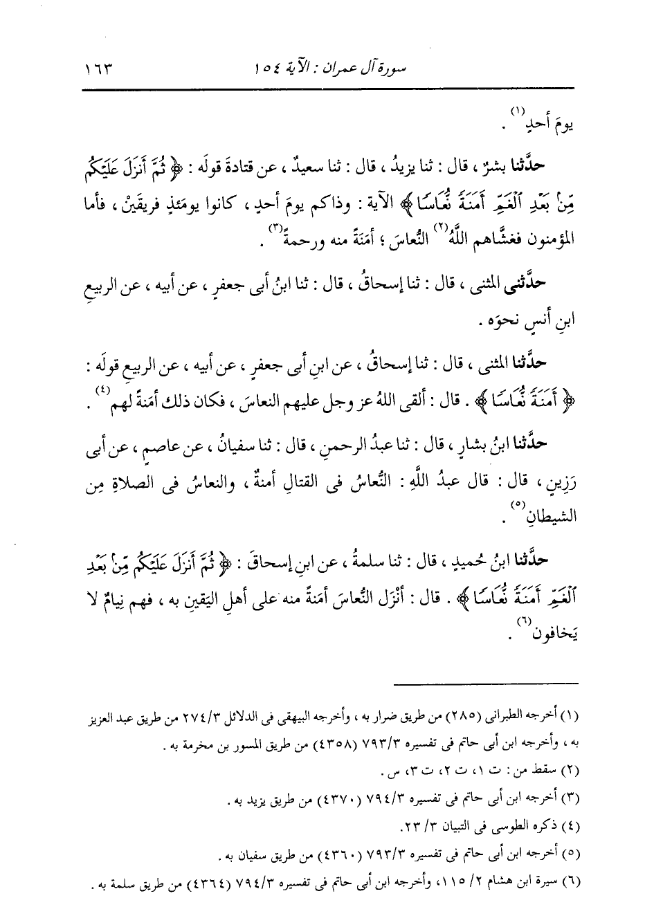 حَدَّثَنَا ابْنُ حُمَيْدٍ، قَالَ: ثنا سَلَمَةُ، عَنِ ابْنِ إِسْحَاقَ: {§ثُمَّ أَنْزَلَ عَلَيْكُمْ مِنْ بَعْدِ الْغَمِّ أَمَنَةً نُعَاسًا} [آل عمران: 154] قَالَ: «أَنْزَلَ النُّعَاسَ أَمَنَةً مِنْهُ عَلَى أَهْلِ الْيَقِينِ بِهِ، فَهُمْ نِيَامٌ لَا يَخَافُونَ»