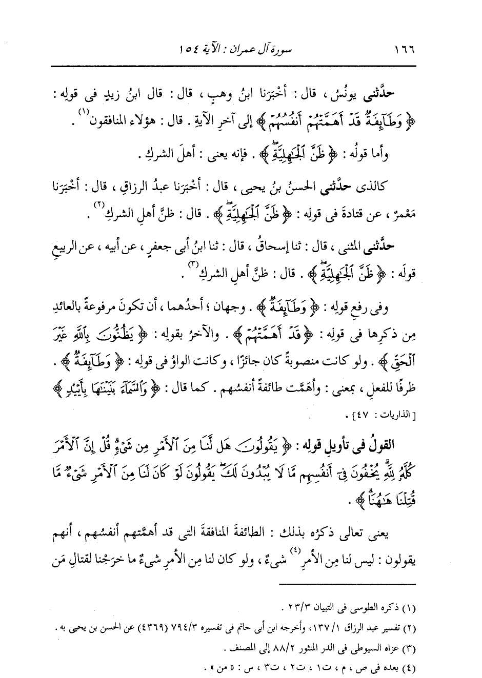 حَدَّثَنِي الْمُثَنَّى، قَالَ: ثنا إِسْحَاقُ، قَالَ: ثنا ابْنُ أَبِي جَعْفَرٍ، عَنْ أَبِيهِ، عَنِ الرَّبِيعِ، قَوْلُهُ: {§ظَنَّ الْجَاهِلِيَّةِ} [آل عمران: 154] قَالَ: «ظَنَّ أَهْلِ الشِّرْكِ» وَفِي رَفْعِ قَوْلِهِ: {وَطَائِفَةٌ} [آل عمران: 154] وَجْهَانِ: أَحَدُهُمَا أَنْ تَكُونَ مَرْفُوعَةً بِالْعَائِدِ مِنْ ذِكْرِهَا فِي قَوْلِهِ: {قَدْ أَهَمَّتْهُمْ} [آل عمران: 154] ، وَالْآخَرُ بِقَوْلِهِ: {يَظُنُّونَ بِاللَّهِ غَيْرَ الْحَقِّ} [آل عمران: 154] وَلَوْ كَانَتْ مَنْصُوبَةً كَانَ جَائِزًا، وَكَانَتِ الْوَاوُ فِي قَوْلِهِ: {وَطَائِفَةٌ} [آل عمران: 154] ظَرْفًا لِلْفِعْلِ، بِمَعْنَى: وَأَهَمَّتْ طَائِفَةً أَنْفُسُهُمْ، كَمَا قَالَ: {وَالسَّمَاءَ بَنَيْنَاهَا بِأَيْدٍ} [الذاريات: 47]