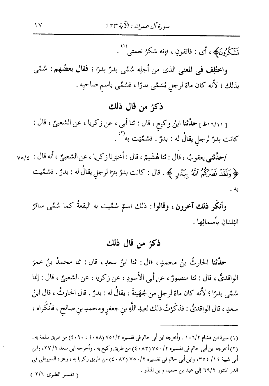 حَدَّثَنِي يَعْقُوبُ، قَالَ: ثنا هُشَيْمٌ، قَالَ: أَخْبَرَنَا زَكَرِيَّا، عَنِ الشَّعْبِيِّ أَنَّهُ قَالَ: {§وَلَقَدْ نَصَرَكُمُ اللَّهُ بِبَدْرٍ} [آل عمران: 123] قَالَ: «كَانَتْ بَدْرٌ بِئْرًا لِرَجُلٍ يُقَالُ لَهُ بَدْرٌ، فَسُمِّيَتْ بِهِ» وَأَنْكَرَ ذَلِكَ آخَرُونَ وَقَالُوا: ذَلِكَ اسْمٌ سُمِّيَتْ بِهِ الْبُقْعَةُ كَمَا سُمِّيَ سَائِرُ الْبُلْدَانِ بِأَسْمَائِهَا