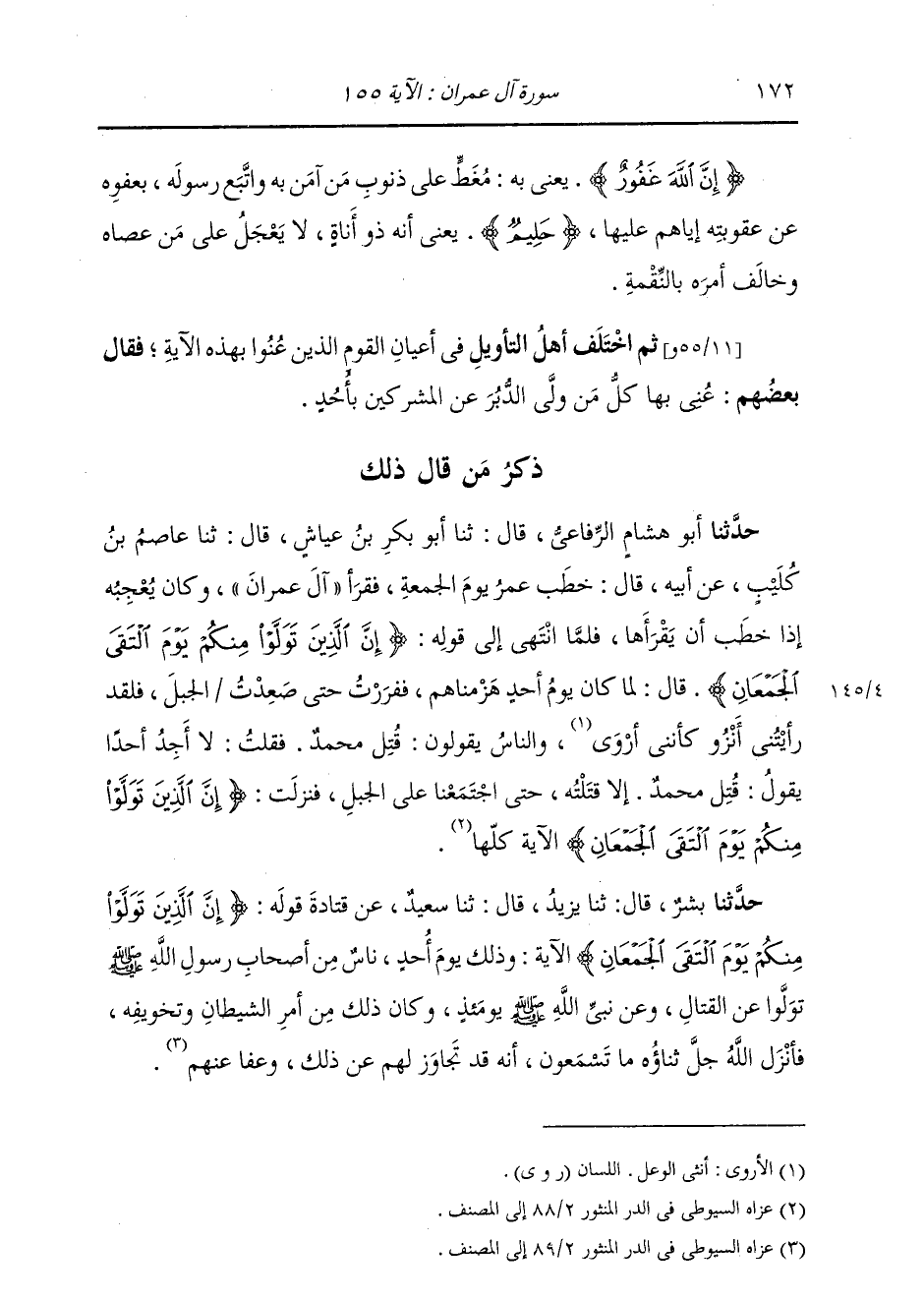 حَدَّثَنَا بِشْرٌ، قَالَ: ثنا يَزِيدُ، قَالَ: ثنا سَعِيدٌ، عَنْ قَتَادَةَ، قَوْلُهُ: {§إِنَّ الَّذِينَ تَوَلَّوْا مِنْكُمْ يَوْمَ الْتَقَى الْجَمْعَانِ} [آل عمران: 155] الْآيَةَ، «وَذَلِكَ يَوْمَ أُحُدٍ، نَاسٌ مِنْ أَصْحَابِ رَسُولِ اللَّهِ صَلَّى اللهُ عَلَيْهِ وَسَلَّمَ تَوَلَّوْا عَنِ الْقِتَالِ وَعَنْ نَبِيِّ اللَّهِ يَوْمَئِذٍ، وَكَانَ ذَلِكَ مِنْ أَمْرِ الشَّيْطَانِ وَتَخْوِيفِهِ، فَأَنْزَلَ اللَّهُ عَزَّ وَجَلَّ مَا تَسْمَعُونَ أَنَّهُ قَدْ تَجَاوَزَ لَهُمْ عَنْ ذَلِكَ، وَعَفَا عَنْهُمْ» -[173]- حَدَّثَنِي الْمُثَنَّى، قَالَ: ثنا إِسْحَاقُ، قَالَ: ثني عَبْدُ اللَّهِ بْنُ أَبِي جَعْفَرٍ، عَنْ أَبِيهِ، عَنِ الرَّبِيعِ، فِي قَوْلِهِ: {إِنَّ الَّذِينَ تَوَلَّوْا مِنْكُمْ يَوْمَ الْتَقَى الْجَمْعَانِ} [آل عمران: 155] الْآيَةَ، فَذَكَرَ نَحْوَ قَوْلِ قَتَادَةَ وَقَالَ آخَرُونَ: بَلْ عُنِيَ بِذَلِكَ خَاصٌ مِمَّنْ وَلَّى الدُّبُرَ يَوْمَئِذٍ، قَالُوا: وَإِنَّمَا عُنِيَ بِهِ الَّذِينَ لَحِقُوا بِالْمَدِينَةَ مِنْهُمْ دُونَ غَيْرِهِمْ