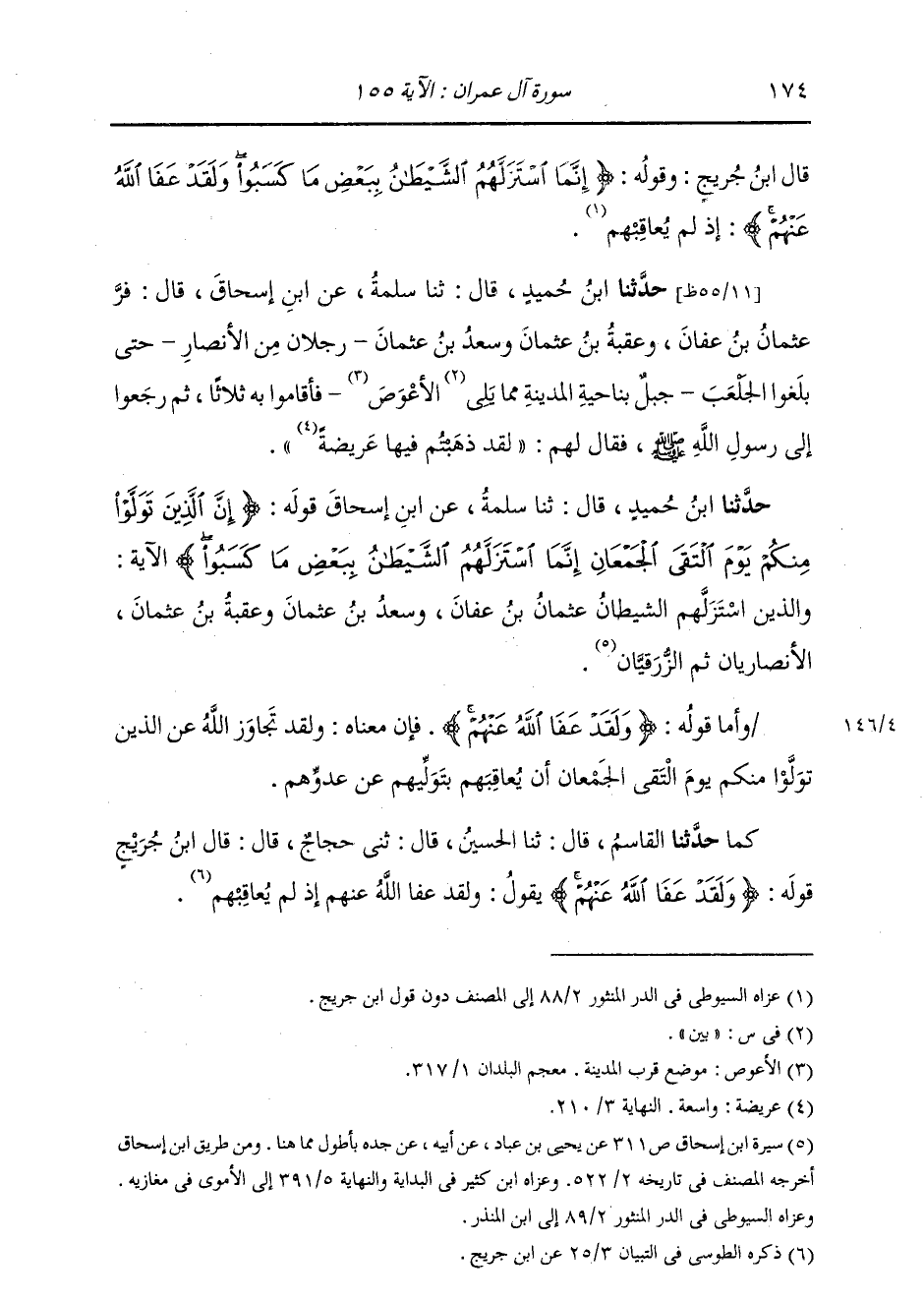 حَدَّثَنَا ابْنُ حُمَيْدٍ، قَالَ: ثنا سَلَمَةُ، عَنِ ابْنِ إِسْحَاقَ، قَوْلُهُ: {§إِنَّ الَّذِينَ تَوَلَّوْا مِنْكُمْ يَوْمَ الْتَقَى الْجَمْعَانِ إِنَّمَا اسْتَزَلَّهُمُ الشَّيْطَانُ بِبَعْضِ مَا كَسَبُوا} [آل عمران: 155] الْآيَةَ، " وَالَّذِينَ اسْتَزَلَّهُمُ الشَّيْطَانُ: عُثْمَانُ بْنُ عَفَّانَ، وَسَعْدُ بْنُ عُثْمَانَ، وَعُقْبَةُ بْنُ عُثْمَانَ الْأَنْصَارِيَّانِ، ثُمَّ الزُّرَقِيَّانِ " وَأَمَّا قَوْلُهُ: {وَلَقَدْ عَفَا اللَّهُ عَنْهُمْ} [آل عمران: 155] فَإِنَّ مَعْنَاهُ: وَلَقَدْ تَجَاوَزَ اللَّهُ عَنِ الَّذِينَ تَوَلَّوْا مِنْكُمْ يَوْمَ الْتَقَى الْجَمْعَانِ، أَنْ يُعَاقِبَهُمْ بِتَوَلِّيهِمْ عَنْ عَدُوِّهِمْ