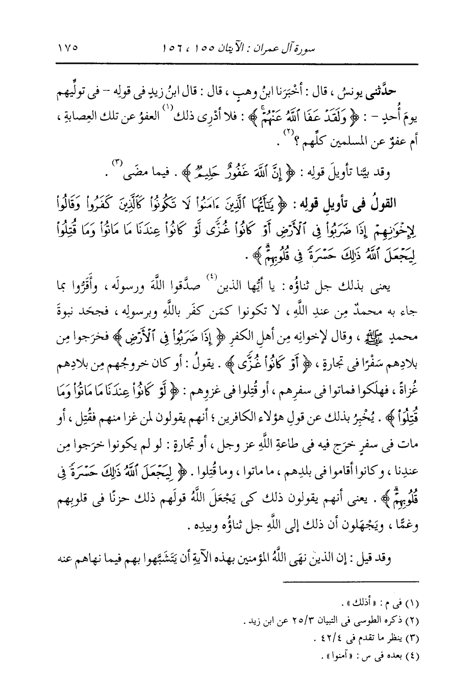 حَدَّثَنِي يُونُسُ، قَالَ: أَخْبَرَنَا ابْنُ وَهْبٍ، قَالَ: قَالَ ابْنُ زَيْدٍ فِي قَوْلِهِ فِي §تَوَلِّيهِمْ يَوْمَ أُحُدٍ: {وَلَقَدْ عَفَا اللَّهُ عَنْهُمْ} [آل عمران: 155] «فَلَا أَدْرِي أَذَلِكَ الْعَفْوُ عَنْ تِلْكِ الْعِصَابَةِ، أَمْ عَفْوٌ عَنِ الْمُسْلِمِينَ كُلِّهِمْ» {إِنَّ اللَّهَ غَفُورٌ} [آل عمران: 155] يَعْنِي بِهِ: مُغَطٍّ عَلَى ذُنُوبِ مَنْ آمَنَ بِهِ وَاتَّبَعَ رَسُولَهُ بِعَفْوِهِ عَنْ عُقُوبَتِهِ إِيَّاهُمْ عَلَيْهَا. {حَلِيمٌ} [آل عمران: 155] يَعْنِي: أَنَّهُ ذُو أَنَاةٍ، لَا يُعَجِّلُ عَلَى مَنْ عَصَاهُ وَخَالَفَ أَمْرَهُ بِالنِّقْمَةِ. وَقَدْ بَيَّنَّا تَأْوِيلِ قَوْلِهِ: {إِنَّ اللَّهَ غَفُورٌ حَلِيمٌ} [آل عمران: 155] فِيمَا مَضَى