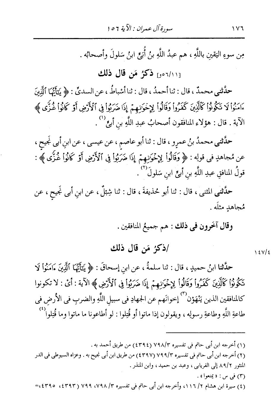 ذِكْرُ مَنْ قَالَ ذَلِكَ: حَدَّثَنِي مُحَمَّدٌ، قَالَ: ثنا أَحْمَدُ، قَالَ: ثنا أَسْبَاطٌ، عَنِ السُّدِّيِّ: {يَا أَيُّهَا الَّذِينَ آمَنُوا §لَا تَكُونُوا كَالَّذِينَ كَفَرُوا وَقَالُوا لِإِخْوَانِهِمْ} [آل عمران: 156] الْآيَةَ، قَالَ: «هَؤُلَاءِ الْمُنَافِقُونَ أَصْحَابُ عَبْدِ اللَّهِ بْنِ أُبَيٍّ»
