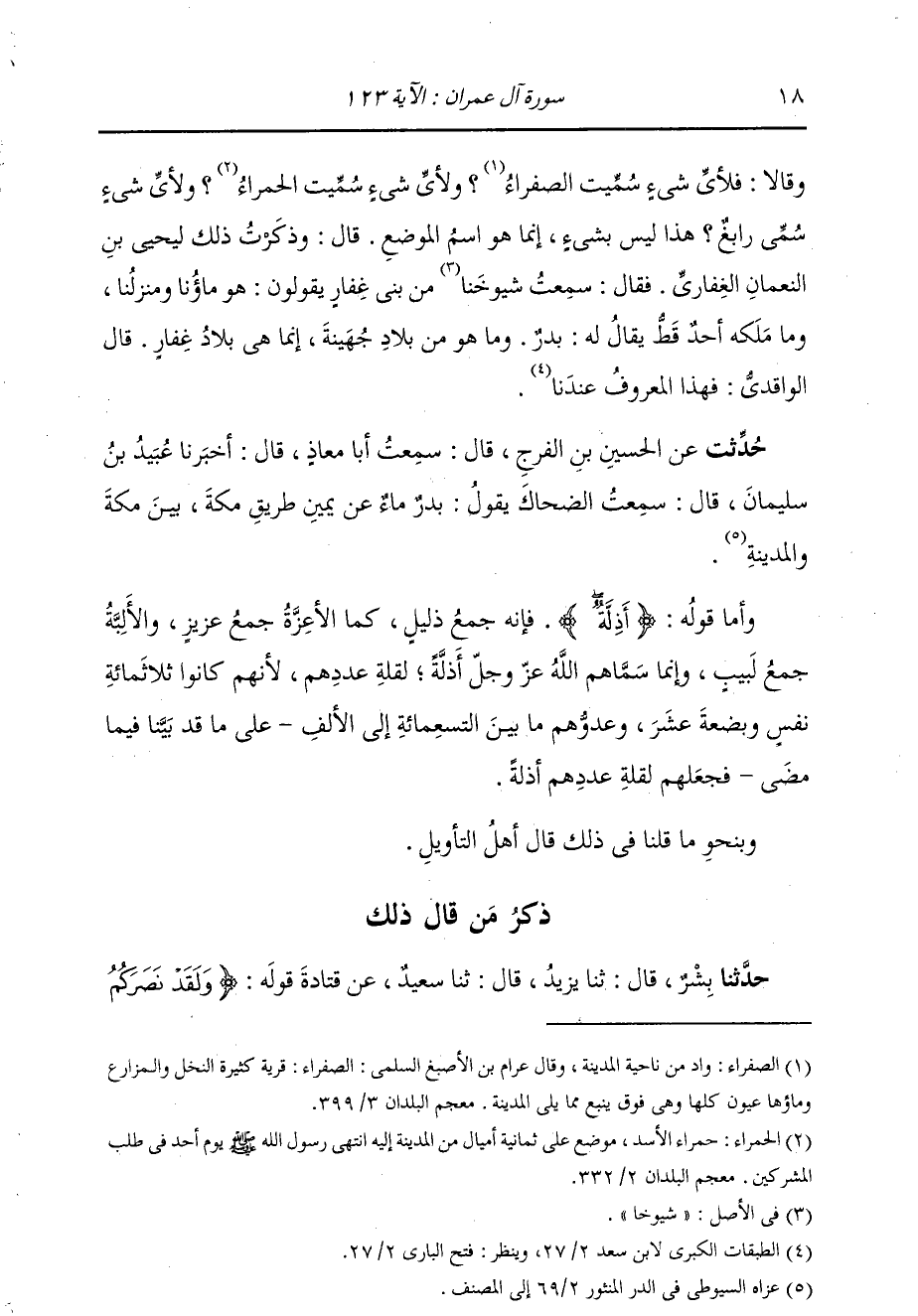 حُدِّثْتُ عَنِ الحَسَنِ بْنِ الْفَرَجِ، قَالَ: سَمِعْتُ أَبَا مُعَاذٍ، قَالَ: أَخْبَرَنَا عُبَيْدُ بْنُ سُلَيْمَانَ، قَالَ: سَمِعْتُ الضَّحَّاكَ، يَقُولُ: «§بَدْرٌ مَاءٌ عَنْ يَمِينِ طَرِيقِ مَكَّةَ بَيْنَ مَكَّةَ وَالْمَدِينَةِ» وَأَمَّا قَوْلُهُ: {أَذِلَّةٌ} [آل عمران: 123] فَإِنَّهُ جَمْعُ ذَلِيلٍ، كَمَا الْأَعِزَّةُ جَمْعُ عَزِيزٍ، وَالْأَلِبَّةُ جَمْعُ لَبِيبٍ، وَإِنَّمَا سَمَّاهُمُ اللَّهُ عَزَّ وَجَلَّ أَذِلَّةً لِقِلَّةِ عَدَدِهِمْ؛ لِأَنَّهُمْ كَانُوا ثَلَاثَمِائَةِ نَفْسٍ وَبِضْعَةَ عَشَرَ، وَعَدُوُّهُمْ مَا بَيْنَ التِّسْعِمِائَةِ إِلَى الْأَلْفِ، عَلَى مَا قَدْ بَيَّنَّا فِيمَا مَضَى، فَجَعَلَهُمْ لِقِلَّةِ عَدَدِهِمْ أَذِلَّةً. وَبِنَحْوِ مَا قُلْنَا فِي ذَلِكَ، قَالَ أَهْلُ التَّأْوِيلِ