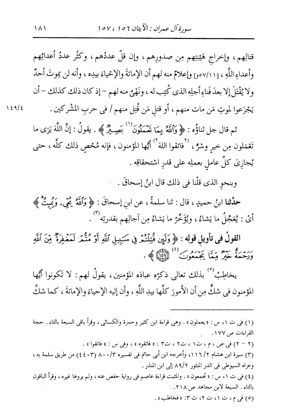 §الْقَوْلُ فِي تَأْوِيلِ قَوْلِهِ تَعَالَى: {وَلَئِنْ قَتَلْتُمْ فِي سَبِيلِ اللَّهِ أَوْ مُتُّمْ لَمَغْفِرَةٌ مِنَ اللَّهِ وَرَحْمَةٌ خَيْرٌ مِمَّا يَجْمَعُونَ} [آل عمران: 157] يُخَاطِبُ جَلَّ ثناؤُهُ عِبَادَهُ الْمُؤْمِنِينَ يَقُولُ لَهُمْ: لَا تَكُونُوا أَيُّهَا الْمُؤْمِنُونَ فِي شَكٍّ مِنْ أَنَّ الْأُمُورَ كُلَّهَا بِيَدِ اللَّهِ، وَأَنَّ إِلَيْهِ الْإِحْيَاءَ وَالْإِمَاتَةَ، كَمَا شَكَّ -[182]- الْمُنَافِقُونَ فِي ذَلِكَ، وَلَكِنْ جَاهِدُوا فِي سَبِيلِ اللَّهِ، وَقَاتِلُوا أَعْدَاءَ اللَّهِ عَلَى يَقِينٍ مِنْكُمْ بِأَنَّهُ لَا يُقْتَلُ فِي حَرْبٍ، وَلَا يَمُوتُ فِي سَفَرٍ إِلَّا مَنْ بَلَغَ أَجَلَهُ وَحَانَتْ وَفَاتُهُ، ثُمَّ وَعَدَهُمْ عَلَى جِهَادِهِمْ فِي سَبِيلِهِ الْمَغْفِرَةَ وَالرَّحْمَةَ، وَأَخْبَرَهُمْ أَنَّ مَوْتًا فِي سَبِيلِ اللَّهِ وَقَتْلًا فِي اللَّهِ خَيْرٌ لَهُمْ مِمَّا يَجْمَعُونَ فِي الدُّنْيَا مِنْ حُطَامِهَا وَرَغِيدِ عَيْشِهَا الَّذِي مِنْ أَجَلِهِ يَتَثَاقَلُونَ عَنِ الْجِهَادِ فِي سَبِيلِ اللَّهِ وَيَتَأَخَّرُونَ عَنْ لِقَاءِ الْعَدُوِّ