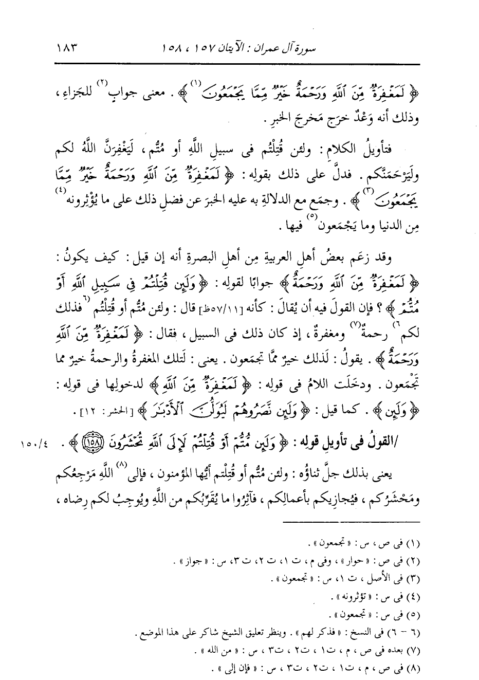 §الْقَوْلُ فِي تَأْوِيلِ قَوْلِهِ تَعَالَى: {وَلَئِنْ مُتُّمْ أَوْ قُتِلْتُمْ لَإِلَى اللَّهِ تُحْشَرُونَ} [آل عمران: 158] يَعْنِي بِذَلِكَ جَلَّ ثناؤُهُ: وَلَئِنْ مُتُّمْ أَوْ قُتِلْتُمْ أَيُّهَا الْمُؤْمِنُونَ، فَإِنَّ إِلَى اللَّهِ مَرْجِعَكُمْ وَمَحْشَرَكُمْ، فَيُجَازِيكُمْ بِأَعْمَالِكُمْ، فَآثِرُوا مَا يُقَرِّبُكُمْ مِنَ اللَّهِ، وَيُوجِبُ لَكُمْ رِضَاهُ، -[184]- وَيُقَرِّبُكُمْ مِنَ الْجَنَّةِ، مِنَ الْجِهَادِ فِي سَبِيلِ اللَّهِ، وَالْعَمَلِ بِطَاعَتِهِ عَلَى الرُّكُونِ إِلَى الدُّنْيَا، وَمَا تَجْمَعُونَ فِيهَا مِنْ حُطَامِهَا الَّذِي هُوَ غَيْرُ بَاقٍ لَكُمْ، بَلْ هُوَ زَائِلٌ عَنْكُمْ، وَعَلَى تَرْكِ طَاعَةِ اللَّهِ وَالْجِهَادِ، فَإِنَّ ذَلِكَ يُبْعِدُكُمْ عَنْ رَبِّكُمْ، وَيُوجِبُ لَكُمْ سَخَطَهُ، وَيُقَرِّبُكُمْ مِنَ النَّارِ. وَبِنَحْوِ الَّذِي قُلْنَا فِي ذَلِكَ، قَالَ ابْنُ إِسْحَاقَ