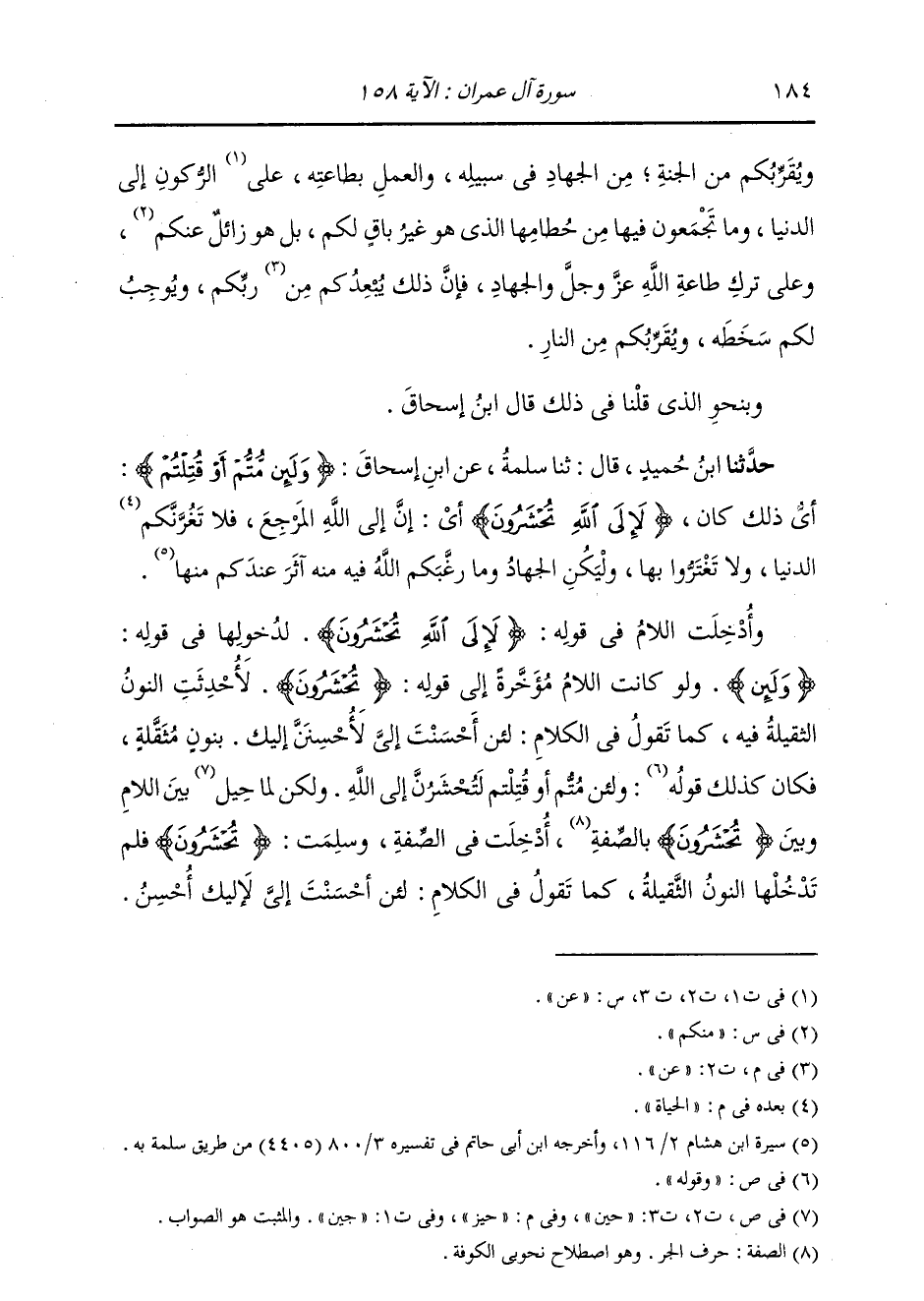 حَدَّثَنَا ابْنُ حُمَيْدٍ، قَالَ: ثنا سَلَمَةُ، عَنِ ابْنِ إِسْحَاقَ: {§وَلَئِنْ مُتُّمْ أَوْ قُتِلْتُمْ} [آل عمران: 158] «أَيْ ذَلِكَ كَانَ» {لَإِلَى اللَّهِ تُحْشَرُونَ} [آل عمران: 158] «أَيْ أَنَّ إِلَى اللَّهِ الْمَرْجِعَ، فَلَا تَغُرَّنَّكُمُ الْحَيَاةُ الدُّنْيَا، وَلَا تَغْتَرُّوا بِهَا، وَلْيَكُنِ الْجِهَادُ وَمَا رَغَّبَكُمُ اللَّهُ فِيهِ مِنْهُ آثَرَ عِنْدَكُمْ مِنْهَا» وَأُدْخِلَتِ اللَّامُ فِي قَوْلِهِ: {لَإِلَى اللَّهِ تُحْشَرُونَ} [آل عمران: 158] لِدُخُولِهَا فِي قَوْلِهِ {وَلَئِنْ} [آل عمران: 158] ، وَلَوْ كَانَتِ اللَّامُ مُؤَخَّرَةً، إِلَى قَوْلِهِ: {تُحْشَرُونَ} [آل عمران: 158] ، لَأُحْدِثَتِ النُّونُ الثَّقِيلَةُ فِيهِ، كَمَا تَقُولُ فِي الْكَلَامِ: لَئِنْ أَحْسَنْتَ إِلَيَّ لَأُحْسِنِنَّ إِلَيْكَ، بَنُونٍ مُثَقَّلَةٍ، فَكَانَ كَذَلِكَ قَوْلُهُ: «وَلَئِنْ مُتُّمْ أَوْ قُتِلْتُمْ لَتُحْشَرُنَّ إِلَى اللَّهِ» ، وَلَكِنْ لَمَّا حُيِّزَ بَيْنَ اللَّامِ وَبَيْنَ «تُحْشَرُونَ» بِالصِّفَةِ أُدْخِلَتْ فِي الصِّفَةِ، وَسَلِمَتْ «تُحْشَرُونَ» ، فَلَمْ تَدْخُلْهَا النُّونُ الثَّقِيلَةُ، كَمَا تَقُولُ فِي الْكَلَامِ: لَئِنْ أَحْسَنْتَ إِلَيَّ لَإِلَيْكَ أُحْسِنُ، -[185]- بِغَيْرِ نُونٍ مُثَقَّلَةٍ