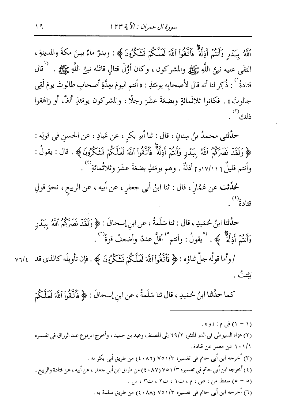 حَدَّثَنَا ابْنُ حُمَيْدٍ، قَالَ: ثنا سَلَمَةُ، عَنِ ابْنِ إِسْحَاقَ: {§وَلَقَدْ نَصَرَكُمُ اللَّهُ بِبَدْرٍ وَأَنْتُمْ أَذِلَّةٌ} [آل عمران: 123] «أَقَلُّ عَدَدًا وَأَضْعَفُ قُوَّةً» وَأَمَّا قَوْلُهُ: {فَاتَّقُوا اللَّهَ لَعَلَّكُمْ تَشْكُرُونَ} [آل عمران: 123] فَإِنَّ تَأْوِيلَهُ كَالَّذِي قَدْ بَيَّنْتُ