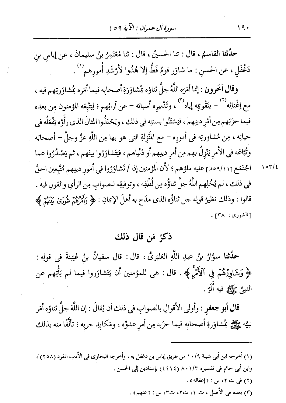ذِكْرُ مَنْ قَالَ ذَلِكَ: حَدَّثَنَا سَوَّارُ بْنُ عَبْدِ اللَّهِ الْعَنْبَرِيُّ، قَالَ: قَالَ سُفْيَانُ بْنُ عُيَيْنَةَ فِي قَوْلِهِ: {§وَشَاوِرْهُمْ فِي الْأَمْرِ} [آل عمران: 159] قَالَ: «هِيَ لِلْمُؤْمِنِينَ أَنْ يَتَشَاوَرُوا فِيمَا لَمْ يَأْتِهِمْ عَنِ النَّبِيِّ صَلَّى اللهُ عَلَيْهِ وَسَلَّمَ فِيهِ أَثَرٌ» قَالَ أَبُو جَعْفَرٍ: وَأَوْلَى الْأَقْوَالِ بِالصَّوَابِ فِي ذَلِكَ أَنْ يُقَالَ: إِنَّ اللَّهَ عَزَّ وَجَلَّ أَمَرَ نَبِيَّهُ صَلَّى اللهُ عَلَيْهِ وَسَلَّمَ بِمُشَاوَرَةِ أَصْحَابِهِ، فِيمَا حَزَّ بِهِ مِنْ أَمْرِ عَدُوِّهِ وَمَكَايِدِ حَرْبِهِ، تَأَلُّفًا مِنْهُ بِذَلِكَ