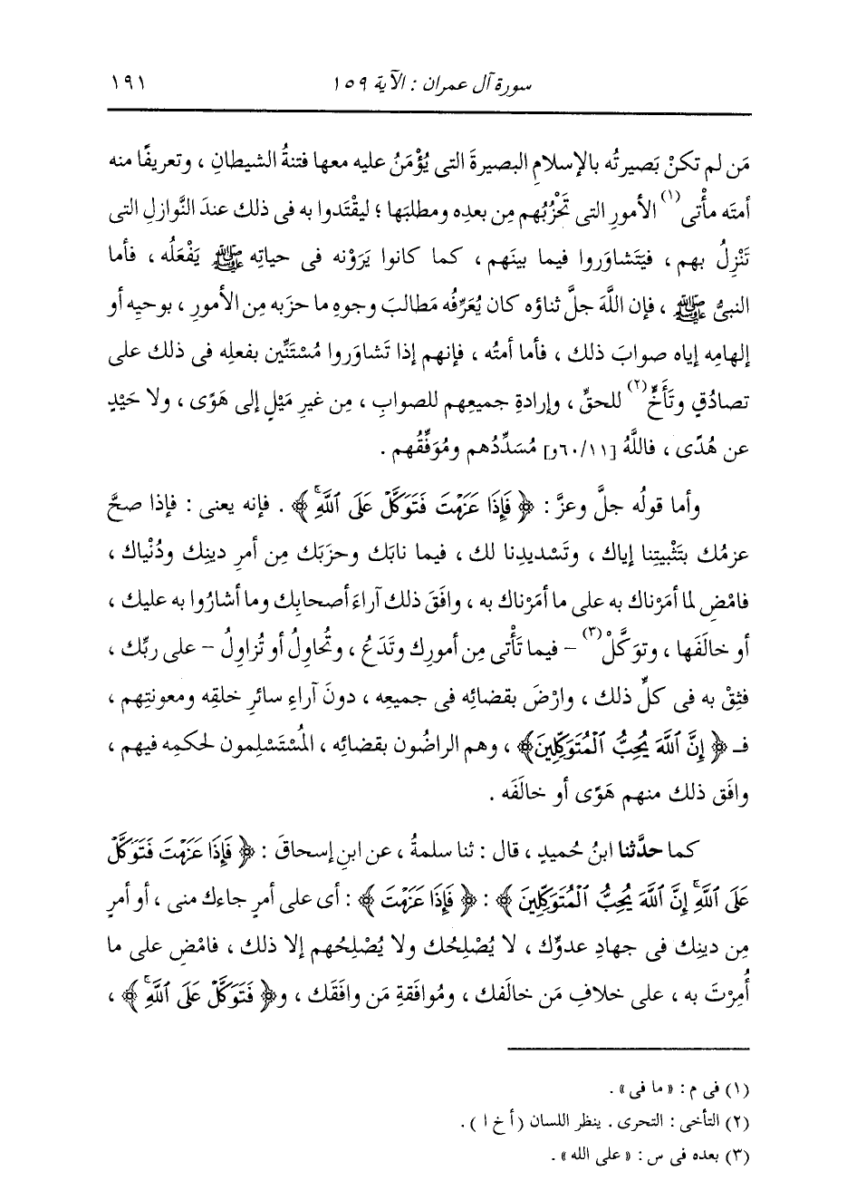 مَنْ لَمْ تَكُنْ بَصِيرَتُهُ بِالْإِسْلَامِ الْبَصَيْرَةَ الَّتِي يُؤْمِنُ عَلَيْهِ مَعَهَا فِتْنَةُ الشَّيْطَانِ، وَتَعْرِيفًا مِنْهُ أُمَّتَهُ مَا فِي الْأُمُورِ الَّتِي تَحْزُبُهُمْ مِنْ بَعْدِهِ وَمَطْلَبَهَا، لِيَقْتَدُوا بِهِ فِي ذَلِكَ عِنْدَ النَّوَازِلِ الَّتِي تَنْزِلُ بِهِمْ، فَيَتَشَاوَرُوا فِيمَا بَيْنَهُمْ، كَمَا كَانُوا يَرَوْنَهُ فِي حَيَاتِهِ صَلَّى اللهُ عَلَيْهِ وَسَلَّمَ يَفْعَلُهُ، فَأَمَّا النَّبِيُّ صَلَّى اللهُ عَلَيْهِ وَسَلَّمَ، فَإِنَّ اللَّهَ كَانَ يُعَرِّفُهُ مَطَالِبَ وُجُوهِ مَا حَزَبَهُ مِنَ الْأُمُورِ بِوَحْيِهِ أَوْ إِلْهَامِهِ إِيَّاهُ صَوَابَ ذَلِكَ. وَأَمَّا أُمَّتُهُ، فَإِنَّهُمْ إِذَا تَشَاوَرُوا مُسْتَنِّينَ بِفِعْلِهِ فِي ذَلِكَ عَلَى تَصَادُقٍ وَتَأخٍّ لِلْحَقِّ وَإِرَادَةِ جَمِيعِهِمْ لِلصَّوَابِ، مِنْ غَيْرِ مَيْلٍ إِلَى هَوًى، وَلَا حَيْدٍ عَنْ هُدًى؛ فَاللَّهُ مُسَدِّدُهُمْ وَمُوَفِّقُهُمْ. وَأَمَّا قَوْلُهُ: {فَإِذَا عَزَمْتَ فَتَوَكَّلْ عَلَى اللَّهِ} [آل عمران: 159] فَإِنَّهُ يَعْنِي: فَإِذَا صَحَّ عَزْمُكَ بِتَثْبِيتِنَا إِيَّاكَ وَتَسْدِيدِنَا لَكَ فِيمَا نَابَكَ وَحَزَبَكَ مِنْ أَمْرِ دِينِكَ وَدُنْيَاكَ، فَامْضِ لِمَا أَمَرْنَاكَ بِهِ عَلَى مَا أَمَرْنَاكَ بِهِ، وَافَقَ ذَلِكَ آرَاءَ أَصْحَابِكَ وَمَا أَشَارُوا بِهِ عَلَيْكَ أَوْ خَالَفَهَا، وَتَوَكَّلْ فِيمَا تَأْتِي مِنْ أُمُورِكَ وَتَدَعُ وَتُحَاوِلُ أَوْ تُزَاوِلُ عَلَى رَبِّكَ، فَثِقْ بِهِ فِي كُلِّ ذَلِكَ، وَارْضَ بِقَضَائِهِ فِي جَمِيعِهِ دُونَ آرَاءِ سَائِرِ خَلْقِهِ وَمَعُونَتِهِمْ، فَإِنَّ اللَّهَ يُحِبُّ الْمُتَوَكِّلِينَ، وَهُمُ الرَّاضُونَ بِقَضَائِهِ، وَالْمُسْتَسْلِمُونَ لِحُكْمِهِ فِيهِمْ، وَافَقَ ذَلِكَ مِنْهُمْ هَوًى أَوْ خَالَفَهُ