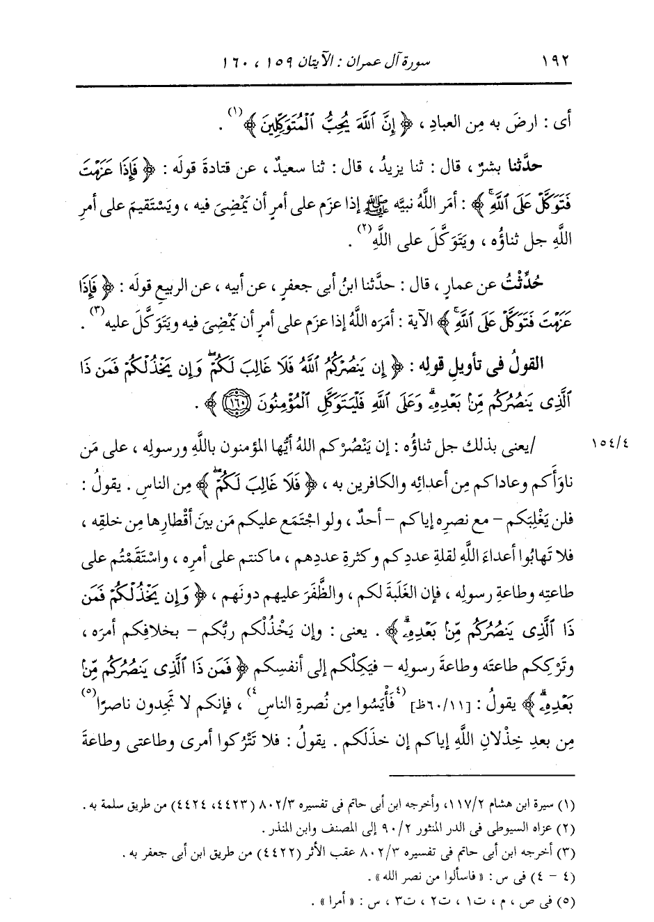 §الْقَوْلُ فِي تَأْوِيلِ قَوْلِهِ تَعَالَى: {إِنْ يَنْصُرْكُمُ اللَّهُ فَلَا غَالِبَ لَكُمْ وَإِنْ يَخْذُلْكُمْ فَمَنْ ذَا الَّذِي يَنْصُرُكُمْ مِنْ بَعْدِهِ وَعَلَى اللَّهِ فَلْيَتَوَكَّلِ الْمُؤْمِنُونَ} [آل عمران: 160] يَعْنِي تَعَالَى ذِكْرُهُ بِذَلِكَ إنْ يَنْصُرْكُمُ اللَّهُ أَيُّهَا الْمُؤْمِنُونَ بِاللَّهِ وَرَسُولِهِ، عَلَى مَنْ نَاوَأَكُمْ وَعَادَاكُمْ مِنْ أَعْدَائِهِ، وَالْكَافِرِينَ بِهِ، فَلَا غَالِبَ لَكُمْ مِنَ النَّاسِ، يَقُولُ: فَلَنْ يَغْلِبَكُمْ مَعَ نَصْرِهِ إِيَّاكُمْ أَحَدٌ، وَلَوِ اجْتَمَعَ عَلَيْكُمْ مِنْ بَيْنِ أَقْطَارِهَا مَنْ خَلَقَهُ، فَلَا تَهَابُوا أَعْدَاءَ اللَّهِ لِقِلَّةِ عَدَدِكُمْ، وَكَثْرَةِ عَدَدِهِمْ، مَا كُنْتُمْ عَلَى أَمْرِهِ، وَاسْتَقَمْتُمْ عَلَى طَاعَتِهِ وَطَاعَةِ رَسُولِهِ، فَإِنَّ الْغَلَبَةَ لَكُمْ وَالظَّفَرَ دُونَهُمْ. {وَإِنْ يَخْذُلْكُمْ فَمَنْ ذَا الَّذِي يَنْصُرُكُمْ مِنْ بَعْدِهِ} [آل عمران: 160] يَعْنِي إِنْ يَخْذُلْكُمْ رَبُّكُمْ، بِخِلَافِكُمْ أَمْرَهُ، وَتَرْكِكُمْ طَاعَتَهُ وَطَاعَةَ رَسُولِهِ، فَيَكِلْكُمْ إِلَى أَنْفُسِكُمْ، فَمَنْ ذَا الَّذِي يَنْصُرُكُمْ مِنْ بَعْدِهِ، يَقُولُ: فَأَيِسُوا مِنْ نُصْرَةِ النَّاسِ، فَإِنَّكُمْ لَا تَجِدُونَ أَمْرًا مِنْ بَعْدِ خُذْلَانِ اللَّهِ إِيَّاكُمْ إِنْ خَذَلَكُمْ، يَقُولُ: فَلَا تَتْرُكُوا أَمْرِي، وَطَاعَتِي وَطَاعَةَ