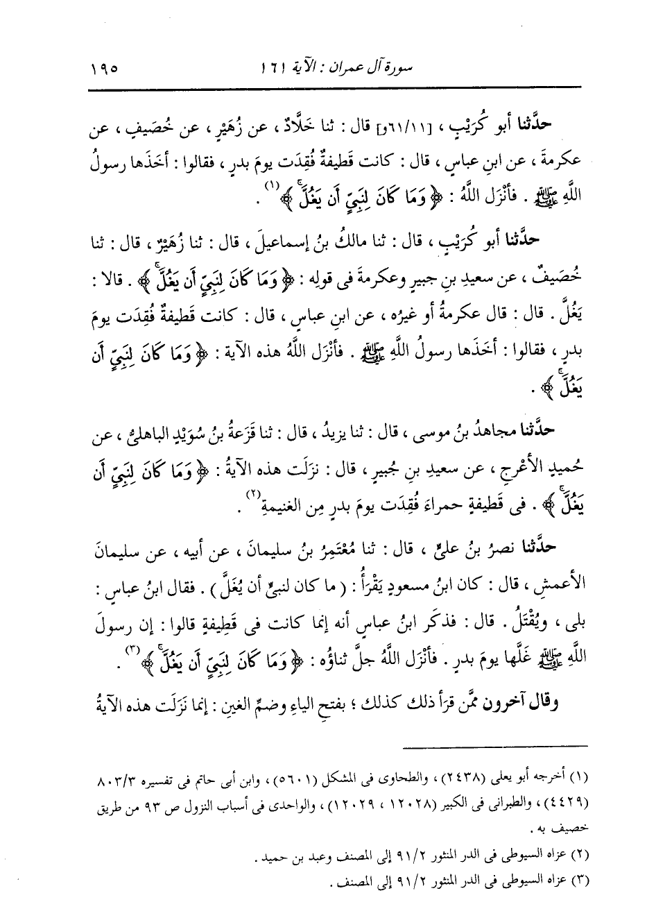 حَدَّثَنَا أَبُو كُرَيْبٍ، قَالَ: ثنا مَالِكُ بْنُ إِسْمَاعِيلَ، قَالَ: ثنا زُهَيْرٌ، قَالَ: ثنا خُصَيْفٌ، عَنْ سَعِيدِ بْنِ جُبَيْرٍ، وَعِكْرِمَةَ، فِي قَوْلِهِ: {§وَمَا كَانَ لِنَبِيٍّ أَنْ يَغُلَّ} [آل عمران: 161] قَالَا: «يَغُلَّ» ، قَالَ: قَالَ عِكْرِمَةُ أَوْ غَيْرُهُ، عَنِ ابْنِ عَبَّاسٍ، قَالَ: " كَانَتْ قَطِيفَةٌ فُقِدَتْ يَوْمَ بَدْرٍ، فَقَالُوا: أَخَذَهَا رَسُولُ اللَّهِ صَلَّى اللهُ عَلَيْهِ وَسَلَّمَ، قَالَ: فَأَنْزَلَ اللَّهُ هَذِهِ الْآيَةَ ": {وَمَا كَانَ لِنَبِيٍّ أَنْ يَغُلَّ} [آل عمران: 161]