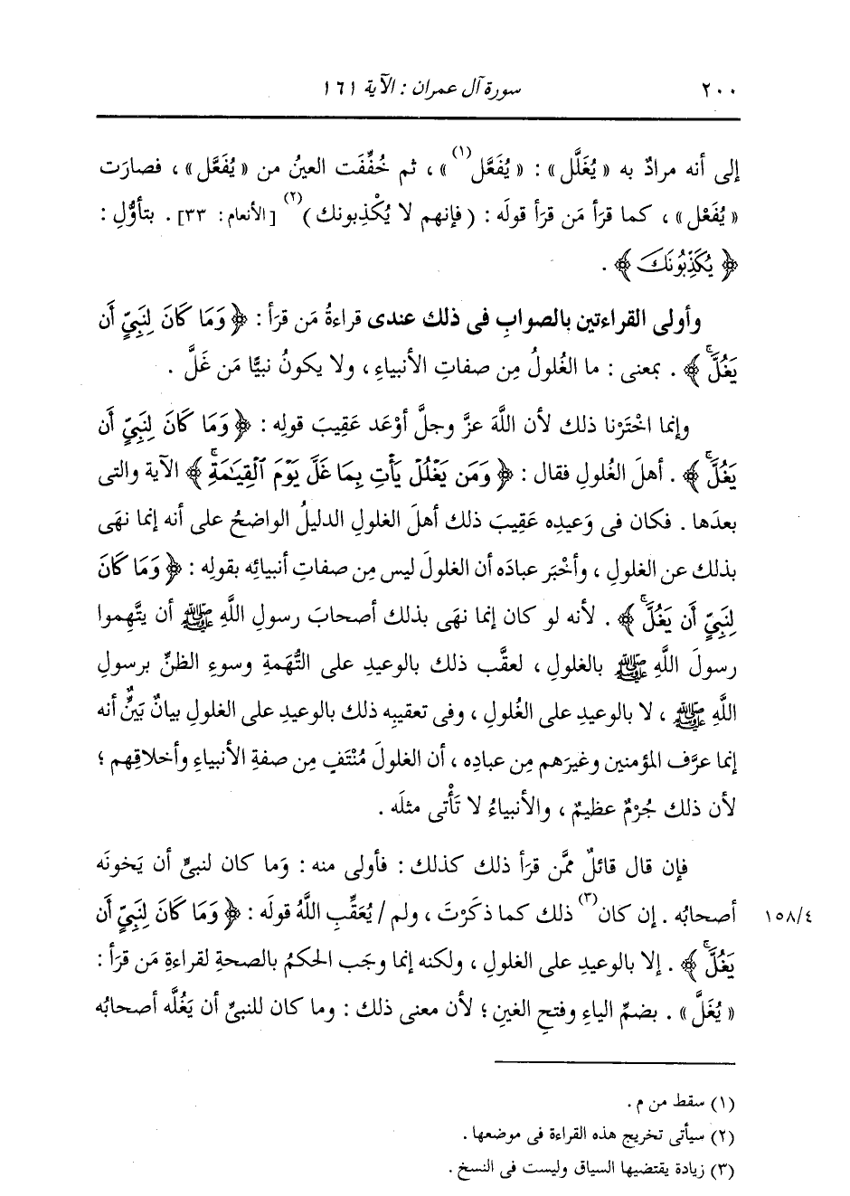 إِلَى أَنَّهُ مُرَادٌ بِهِ «يُغْلَلْ» ، ثُمَّ خُفِّفَتِ الْغَيْنُ مِنْ «يُفَعَّلَ» فَصَارَتْ «يُفْعَلَ» ، كَمَا قَرَأَ مَنْ قَرَأَ قَوْلَهُ: فَإِنَّهُمْ لَا يُكْذِبُونَكَ بِتَأَوُّلِ {يُكَذِّبُونَكَ} [الأنعام: 33] . وَأَوْلَى الْقِرَاءَتَيْنِ بِالصَّوَابِ فِي ذَلِكَ عِنْدِي قِرَاءَةُ مَنْ قَرَأَ: {وَمَا كَانَ لِنَبِيٍّ أَنْ يَغُلَّ} [آل عمران: 161] بِمَعْنَى: مَا الْغُلُولُ مِنْ صِفَاتِ الْأَنْبِيَاءِ، وَلَا يَكُونُ نَبِيًّا مَنْ غَلَّ، وَإِنَّمَا اخْتَرْنَا ذَلِكَ؛ لِأَنَّ اللَّهَ عَزَّ وَجَلَّ أَوْعَدَ عُقَيْبَ قَوْلِهِ: {وَمَا كَانَ لِنَبِيٍّ أَنْ يَغُلَّ} [آل عمران: 161] أَهْلَ الْغُلُولِ، فَقَالَ: {وَمَنْ يَغْلُلْ يَأْتِ بِمَا غَلَّ يَوْمَ الْقِيَامَةِ} [آل عمران: 161] الْآيَةَ، وَالَّتِي بَعْدَهَا، فَكَانَ فِي وَعِيدِهِ عُقَيْبَ ذَلِكَ أَهْلَ الْغُلُولِ، الدَّلِيلُ الْوَاضِحُ عَلَى أَنَّهُ إِنَّمَا نَهَى بِذَلِكَ عَنِ الْغُلُولِ، وَأَخْبَرَ عِبَادَهُ أَنَّ الْغُلُولَ لَيْسَ مِنْ صِفَاتِ أَنْبِيَائِهِ بِقَوْلِهِ: {وَمَا كَانَ لِنَبِيٍّ أَنْ يَغُلَّ} [آل عمران: 161] لِأَنَّهُ لَوْ كَانَ إِنَّمَا نَهَى بِذَلِكَ أَصْحَابَ رَسُولِ اللَّهِ صَلَّى اللهُ عَلَيْهِ وَسَلَّمَ أَنْ يَتَّهِمُوا رَسُولَ اللَّهِ صَلَّى اللهُ عَلَيْهِ وَسَلَّمَ بِالْغُلُولِ، لَعَقَّبَ ذَلِكَ بِالْوَعِيدِ عَلَى التُّهْمَةِ، وَسُوءِ الظَّنِّ بِرَسُولِ اللَّهِ صَلَّى اللهُ عَلَيْهِ وَسَلَّمَ، لَا بِالْوَعِيدِ عَلَى الْغُلُولِ، وَفِي تَعْقِيبِهِ ذَلِكَ بِالْوَعِيدِ عَلَى الْغُلُولِ بَيَانٌ بَيِّنٌ، أَنَّهُ إِنَّمَا عَرَّفَ الْمُؤْمِنِينَ وَغَيْرَهُمْ مِنْ عِبَادِهِ أَنَّ الْغُلُولَ مُنْتَفٍ مِنْ صِفَةِ الْأَنْبِيَاءِ وَأَخْلَاقِهِمْ؛ لِأَنَّ ذَلِكَ جُرْمٌ عَظِيمٌ، وَالْأَنْبِيَاءُ لَا تَأْتِي مِثْلَهُ. فَإِنْ قَالَ قَائِلٌ مِمَّنْ قَرَأَ ذَلِكَ كَذَلِكَ: فَأَوْلَى مِنْهُ: وَمَا كَانَ لِنَبِيٍّ أَنْ يُخَوِّنَهُ أَصْحَابُهُ إِنْ كَانَ ذَلِكَ كَمَا ذَكَرْتُ، وَلَمْ يُعَقِّبِ اللَّهُ قَوْلَهُ: {وَمَا كَانَ لِنَبِيٍّ أَنْ يَغُلَّ} [آل عمران: 161] إِلَّا بِالْوَعِيدِ عَلَى الْغُلُولِ، وَلَكِنَّهُ إِنَّمَا وَجَبَ الْحُكْمُ بِالصِّحَّةِ لِقِرَاءَةِ مَنْ قَرَأَ: (يُغَلَّ) بِضَمِّ الْيَاءِ وَفَتْحِ الْغَيْنِ؛ لِأَنَّ مَعْنَى ذَلِكَ: وَمَا كَانَ لِلنَّبِيِّ أَنْ يُغِلَّهُ أَصْحَابُهُ،