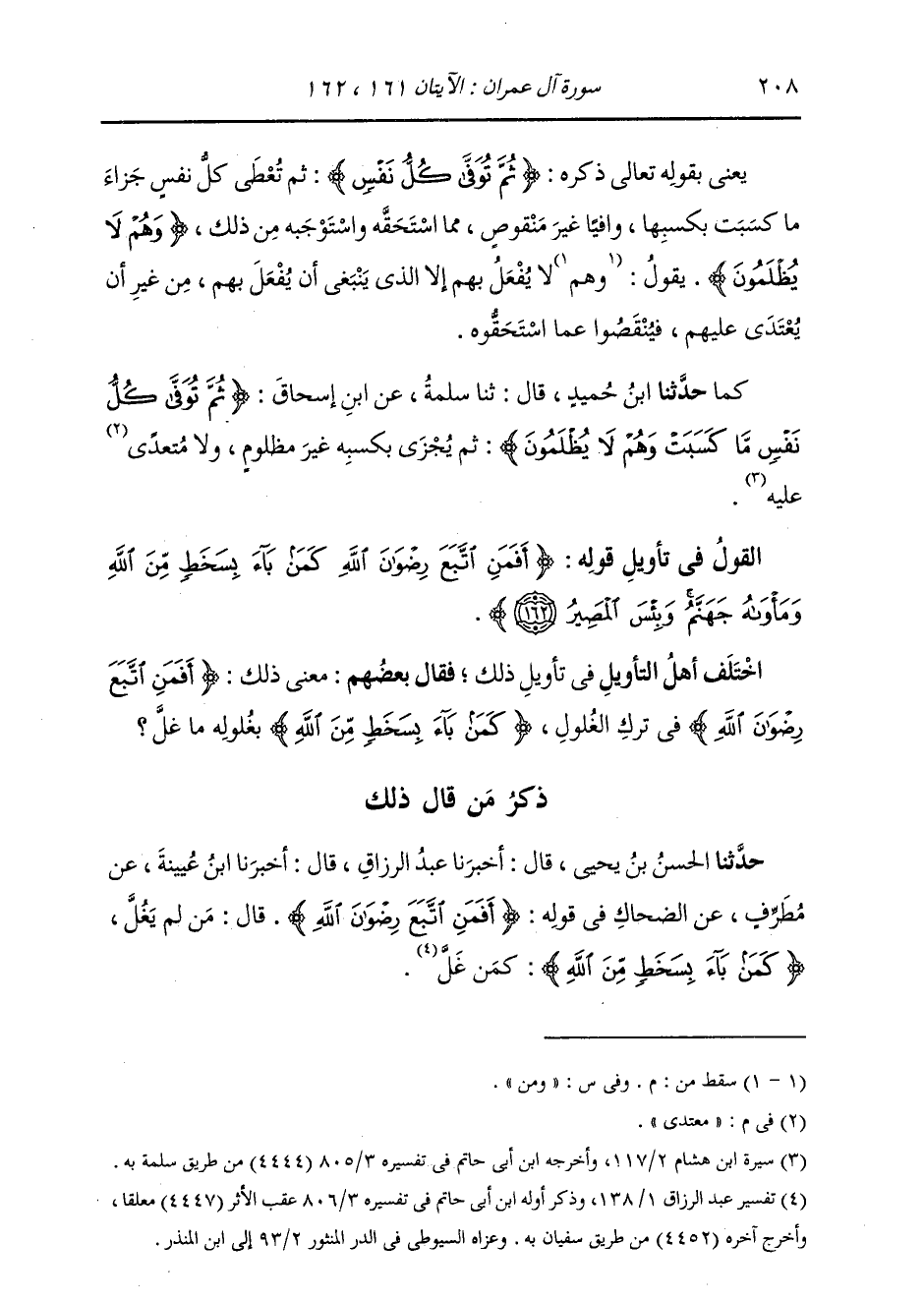 ذِكْرُ مَنْ قَالَ ذَلِكَ: حَدَّثَنَا الْحَسَنُ بْنُ يَحْيَى، قَالَ: أَخْبَرَنَا عَبْدُ الرَّزَّاقِ، قَالَ: أَخْبَرَنَا ابْنُ عُيَيْنَةَ، عَنْ طَرِيفٍ، عَنِ الضَّحَّاكِ، فِي قَوْلِهِ: {§أَفَمَنِ اتَّبَعَ رِضْوَانَ اللَّهِ} [آل عمران: 162] قَالَ: «مَنْ لَمْ يَغُلَّ» {كَمَنْ بَاءَ بِسَخَطٍ مِنَ اللَّهِ} [آل عمران: 162] «كَمَنْ غَلَّ»