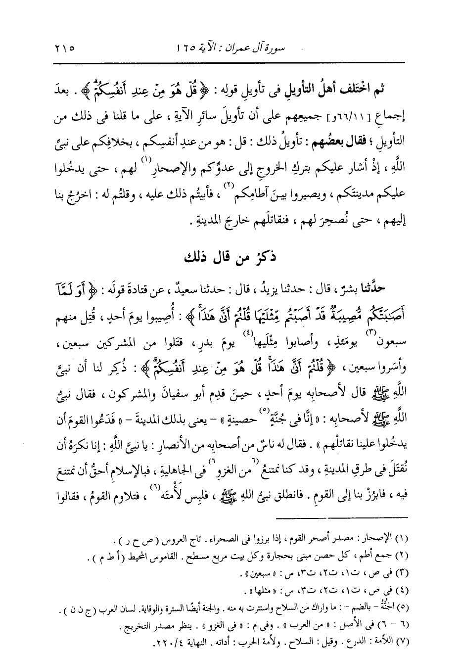ثُمَّ اخْتَلَفَ أَهْلُ التَّأْوِيلِ فِي تَأْوِيلِ قَوْلِهِ: {قُلْ هُوَ مِنْ عِنْدِ أَنْفُسِكُمْ} [آل عمران: 165] بَعْدَ إِجْمَاعِ جَمِيعِهِمْ عَلَى أَنَّ تَأْوِيلَ سَائِرِ الْآيَةِ عَلَى مَا قُلْنَا فِي ذَلِكَ مِنَ التَّأْوِيلِ، فَقَالَ بَعْضُهُمْ: تَأْوِيلُ ذَلِكَ: قُلْ هُوَ مِنْ عِنْدِ أَنْفُسِكُمْ، بِخِلَافِكُمْ عَلَى نَبِيِّ اللَّهِ صَلَّى اللهُ عَلَيْهِ وَسَلَّمَ، إِذْ أَشَارَ عَلَيْكُمْ بِتَرْكِ الْخُرُوجِ إِلَى عَدُوِّكُمْ وَالْإِصْحَارِ لَهُمْ، حَتَّى يَدْخُلُوا عَلَيْكُمْ مَدِينَتَكُمْ، وَيَصِيرُوا بَيْنَ آطَامِكُمْ، فَأَبَيْتُمْ ذَلِكَ عَلَيْهِ، وَقُلْتُمُ: اخْرُجْ بِنَا إِلَيْهِمْ حَتَّى نُصْحِرَ لَهُمْ فَنُقَاتِلَهُمْ خَارِجَ الْمَدِينَةِ