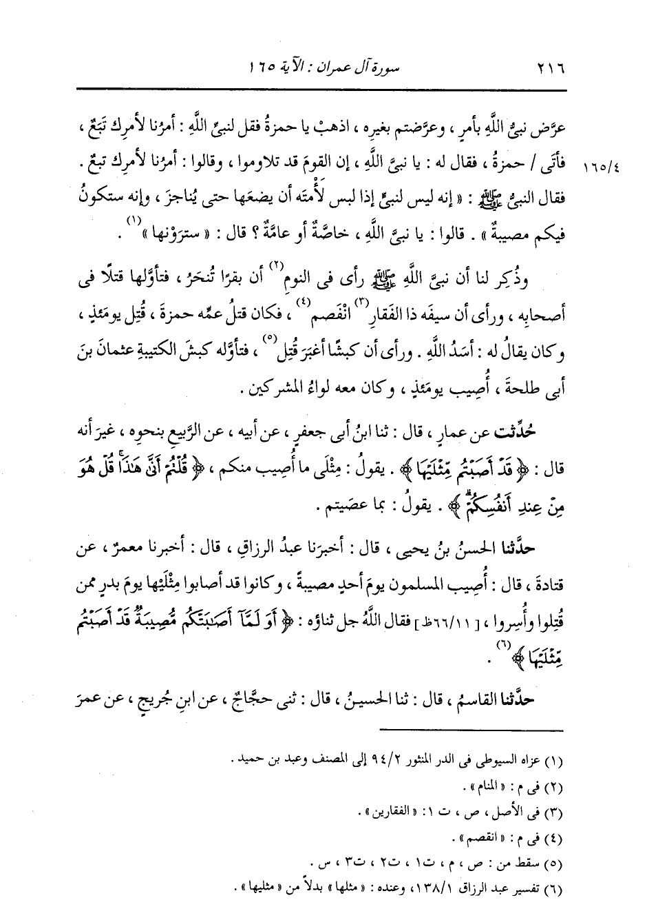 حَدَّثَنَا الْحَسَنُ بْنُ يَحْيَى، قَالَ: أَخْبَرَنَا عَبْدُ الرَّزَّاقِ، قَالَ أَخْبَرَنَا مَعْمَرٌ، عَنْ قَتَادَةَ، قَالَ: «§أُصِيبَ الْمُسْلِمُونَ يَوْمَ أُحُدٍ مُصِيبَةً، وَكَانُوا قَدْ أَصَابُوا مِثْلَيْهَا يَوْمَ بَدْرٍ مِمَّنْ قَتَلُوا وَأَسَرُوا» فَقَالَ اللَّهُ عَزَّ وَجَلَّ: {أَوَلَمَّا أَصَابَتْكُمْ مُصِيبَةٌ قَدْ أَصَبْتُمْ مِثْلَيْهَا} [آل عمران: 165]