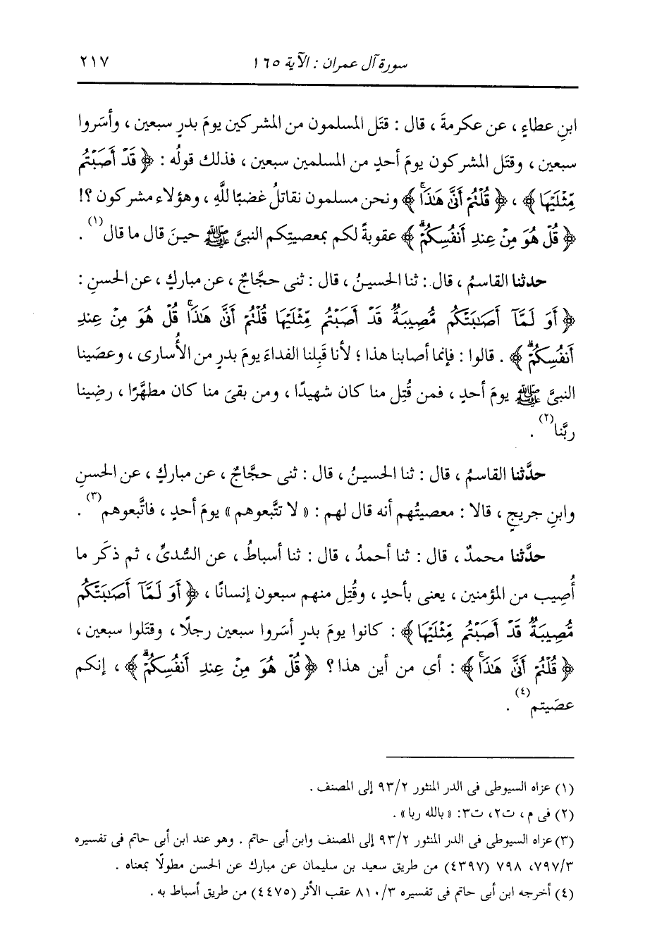 حَدَّثَنَا الْقَاسِمُ، قَالَ: ثنا الْحُسَيْنُ، قَالَ: ثني حَجَّاجٌ، عَنْ مُبَارَكٍ، عَنِ الْحَسَنِ: {§أَوَلَمَّا أَصَابَتْكُمْ مُصِيبَةٌ قَدْ أَصَبْتُمْ مِثْلَيْهَا قُلْتُمْ أَنَّى هَذَا قُلْ هُوَ مِنْ عِنْدِ أَنْفُسِكُمْ} [آل عمران: 165] قَالُوا: «فَإِنَّمَا أَصَابَنَا هَذَا، لَأَنَّا قَبِلْنَا الْفِدَاءَ يَوْمَ بَدْرٍ مِنَ الْأُسَارَى، وَعَصَيْنَا النَّبِيَّ صَلَّى اللهُ عَلَيْهِ وَسَلَّمَ يَوْمَ أُحُدٍ، فَمَنْ قُتِلَ مِنَّا كَانَ شَهِيدًا، وَمَنْ بَقِيَ مِنَّا كَانَ مُطَهَّرًا، رَضِينَا بِاللَّهِ رَبًّا»