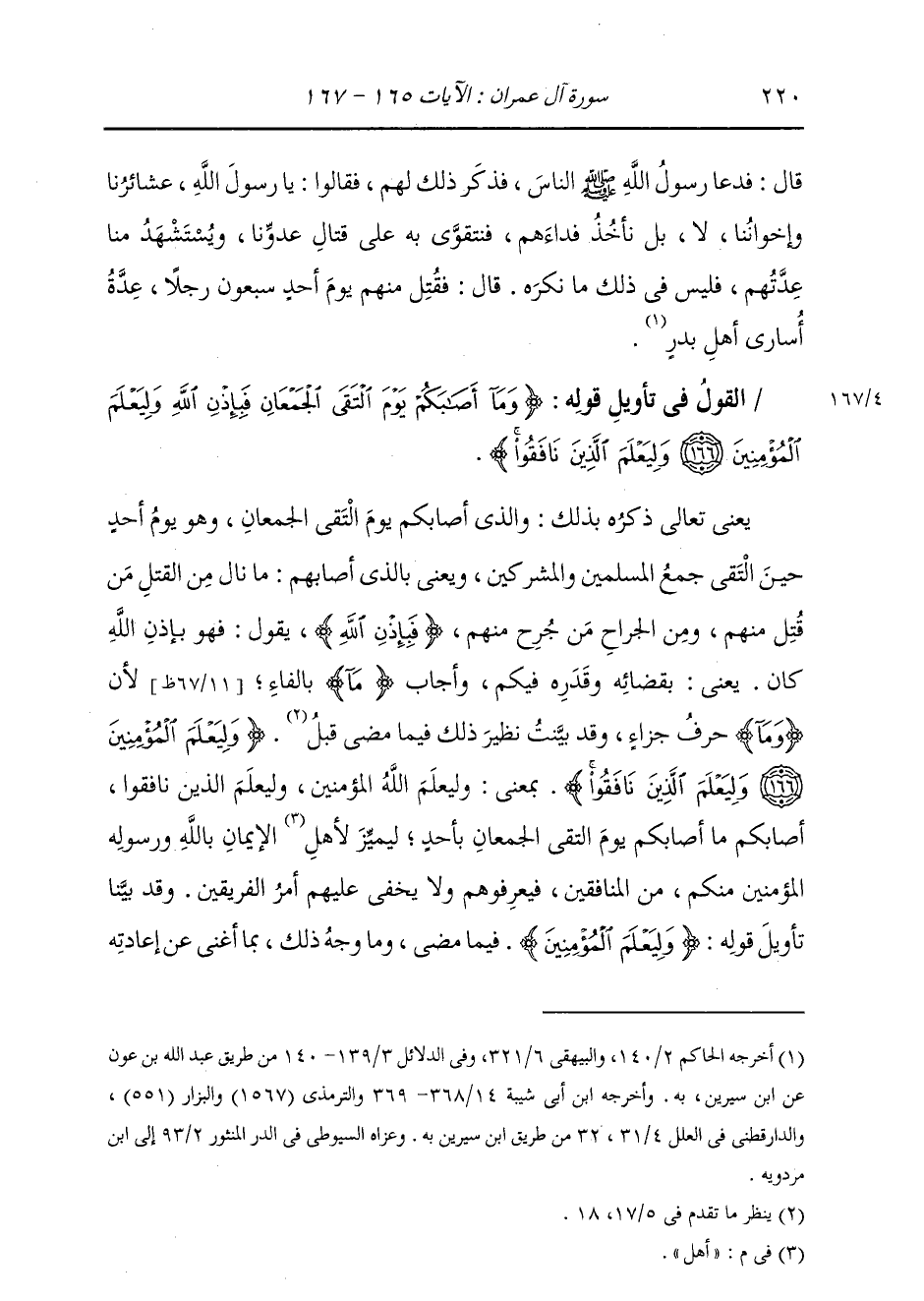 §الْقَوْلُ فِي تَأْوِيلِ قَوْلِهِ تَعَالَى: {وَمَا أَصَابَكُمْ يَوْمَ الْتَقَى الْجَمْعَانِ فَبِإِذْنِ اللَّهِ وَلِيَعْلَمَ الْمُؤْمِنِينَ وَلْيَعْلَمَ الَّذِينَ نَافَقُوا وَقِيلَ لَهُمْ تَعَالَوْا قَاتِلُوا فِي سَبِيلِ اللَّهِ أَوِ ادْفَعُوا قَالُوا لَوْ نَعْلَمُ قِتَالًا لَاتَّبَعْنَاكُمْ هُمْ لِلْكُفْرِ يَوْمَئِذٍ أَقْرَبُ مِنْهُمْ لِلْإِيمَانِ يَقُولُونَ بِأَفْوَاهِهِمْ مَا لَيْسَ فِي قُلُوبِهِمْ وَاللَّهُ أَعْلَمُ بِمَا يَكْتُمُونَ} [آل عمران: 167] يَعْنِي تَعَالَى ذِكْرُهُ بِذَلِكَ: وَالَّذِي أَصَابَكُمْ يَوْمَ الْتَقَى الْجَمْعَانِ، وَهُوَ يَوْمُ أُحُدٍ حِينَ الْتَقَى جَمْعُ الْمُسْلِمِينَ وَالْمُشْرِكِينَ، وَيَعْنِي بِالَّذِي أَصَابَهُمْ: مَا نَالَ مِنَ الْقَتْلِ مَنْ قُتِلَ مِنْهُمْ، وَمِنَ الْجَرَّاحِ مَنْ جُرِحَ مِنْهُمْ {فَبِإِذْنِ اللَّهِ} [آل عمران: 166] يَقُولُ: فَهُوَ بِإِذْنِ اللَّهِ كَانَ، يَعْنِي: بِقَضَائِهِ وَقَدَرِهِ فِيكُمْ، وَأَجَابَ «مَا» بِالْفَاءِ، لِأَنَّ «مَا» حَرْفُ جَزَاءٍ، وَقَدْ بَيَّنْتُ نَظِيرَ ذَلِكَ فِيمَا مَضَى قَبْلُ: {وَلِيَعْلَمَ الْمُؤْمِنِينَ وَلِيَعْلَمَ الَّذِينَ نَافَقُوا} [آل عمران: 166] بِمَعْنَى: وَلِيَعْلَمَ اللَّهُ الْمُؤْمِنِينَ، وَلِيَعْلَمَ الَّذِينَ نَافَقُوا، أَصَابَكُمْ مَا أَصَابَكُمْ يَوْمَ الْتَقَى الْجَمْعَانِ بِأُحُدٍ، لِيَمِيزَ أَهْلَ الْإِيمَانِ بِاللَّهِ وَرَسُولِهِ الْمُؤْمِنِينَ مِنْكُمْ مِنَ الْمُنَافِقِينَ، فَيَعْرِفُونَهُمْ، لَا يَخْفَى عَلَيْهِمْ أَمْرُ الْفَرِيقَيْنِ، وَقَدْ بَيَّنَّا تَأْوِيلَ قَوْلِهِ: {وَلِيَعْلَمَ الْمُؤْمِنِينَ} [آل عمران: 166] فِيمَا مَضَى وَمَا وَجْهُ ذَلِكَ، بِمَا أَغْنَى عَنْ إِعَادَتِهِ