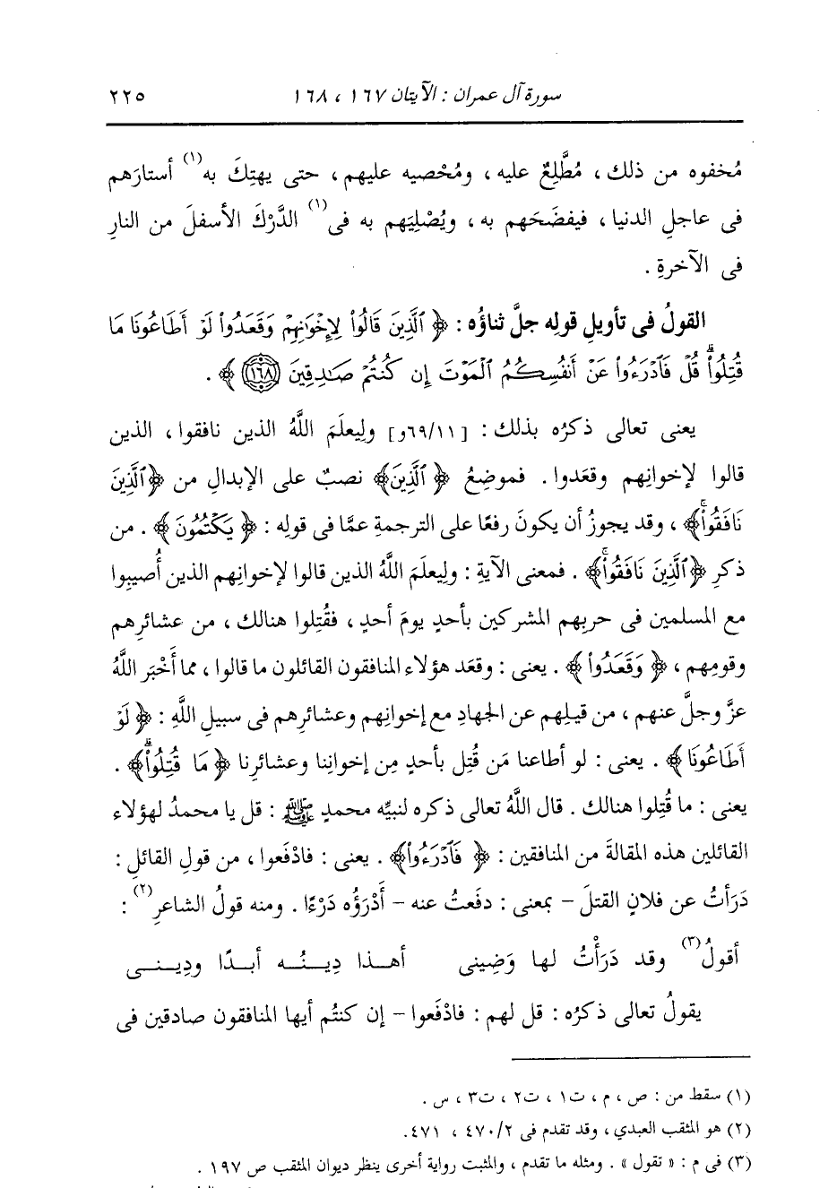 §الْقَوْلُ فِي تَأْوِيلِ قَوْلِهِ تَعَالَى: {الَّذِينَ قَالُوا لِإِخْوَانِهِمْ وَقَعَدُوا لَوْ أَطَاعُونَا مَا قُتِلُوا قُلْ فَادْرَءُوا عَنْ أَنْفُسِكُمُ الْمَوْتَ إِنْ كُنْتُمْ صَادِقِينَ} يَعْنِي تَعَالَى ذِكْرُهُ بِذَلِكَ: وَلِيَعْلَمَ اللَّهُ الَّذِينَ نَافَقُوا، الَّذِينَ قَالُوا لِإِخْوَانِهِمْ وَقَعَدُوا، فَمَوْضِعُ «الَّذِينَ» نَصْبٌ عَلَى الْإِبْدَالِ مِنْ «الَّذِينَ نَافَقُوا» ، وَقَدْ يَجُوزُ أَنْ يَكُونَ رَفْعٌا عَلَى التَّرْجَمَةِ عَمَّا فِي قَوْلِهِ: {يَكْتُمُونَ} [البقرة: 159] مِنْ ذِكْرِ «الَّذِينَ نَافَقُوا» فَمَعْنَى الْآيَةِ: وَلِيَعْلَمَ اللَّهُ الَّذِينَ قَالُوا لِإِخْوَانِهِمُ الَّذِينَ أُصِيبُوا مَعَ الْمُسْلِمِينَ فِي حَرْبِهِمُ الْمُشْرِكِينَ بِأُحُدٍ يَوْمَ أُحُدٍ، فَقُتِلُوا هُنَالِكَ مِنْ عَشَائِرِهِمْ وَقَوْمِهِمْ، {وَقَعَدُوا} [آل عمران: 168] يَعْنِي: وَقَعَدَ هَؤُلَاءِ الْمُنَافِقُونَ الْقَائِلُونَ مَا قَالُوا مِمَّا أَخْبَرَ اللَّهُ عَزَّ وَجَلَّ عَنْهُمْ مِنْ قِيلِهِمْ عَنِ الْجِهَادِ مَعَ إِخْوَانِهِمْ وَعَشَائِرِهِمْ فِي سَبِيلِ اللَّهِ: {لَوْ أَطَاعُونَا} [آل عمران: 168] يَعْنِي: لَوْ أَطَاعَنَا مَنْ قُتِلَ بِأُحُدٍ مِنْ إِخْوَانِنَا وَعَشَائِرِنَا {مَا قُتِلُوا} [آل عمران: 168] يَعْنِي: مَا قُتِلُوا هُنَالِكَ، قَالَ اللَّهُ عَزَّ وَجَلَّ لِنَبِيِّهِ مُحَمَّدٍ صَلَّى اللهُ عَلَيْهِ وَسَلَّمَ: قُلْ يَا مُحَمَّدُ لِهَؤُلَاءِ الْقَائِلِينَ هَذِهِ الْمَقَالَةَ مِنَ الْمُنَافِقِينَ: فَادْرَءُوا، يَعْنِي: فَادْفَعُوا مِنْ قَوْلِ الْقَائِلِ: دَرَأْتُ عَنْ فُلَانٍ الْقَتْلَ، بِمَعْنَى: دَفَعْتُ عَنْهُ، أَدْرَؤُهُ دَرْءًا، وَمِنْهُ قَوْلُ الشَّاعِرِ: