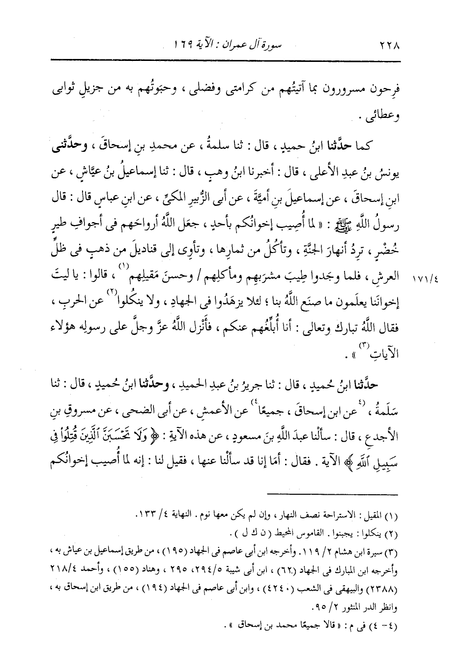كَمَا: حَدَّثَنَا ابْنُ حُمَيْدٍ، قَالَ: ثنا سَلَمَةُ، عَنْ مُحَمَّدِ بْنِ إِسْحَاقَ وَحَدَّثني يُونُسُ بْنُ عَبْدِ الْأَعْلَى، قَالَ: أَخْبَرَنَا ابْنُ وَهْبٍ، قَالَ: ثنا إِسْمَاعِيلُ بْنُ عَيَّاشٍ، عَنِ ابْنِ إِسْحَاقَ، عَنْ إِسْمَاعِيلَ بْنِ أُمَيَّةَ، عَنْ أَبِي الزُّبَيْرِ الْمَكِّيِّ، عَنِ ابْنِ عَبَّاسٍ، قَالَ: قَالَ رَسُولُ اللَّهِ صَلَّى اللهُ عَلَيْهِ وَسَلَّمَ: " §لَمَّا أُصِيبَ إِخْوَانَكُمْ بِأُحُدٍ، جَعَلَ اللَّهُ أَرْوَاحَهُمْ فِي أَجْوَافِ طَيْرٍ خُضْرٍ، تَرِدُ أَنْهَارَ الْجَنَّةِ، وَتَأْكُلُ مِنْ ثِمَارِهَا، وَتَأْوِي إِلَى قَنَادِيلَ مِنْ ذَهَبٍ فِي ظِلِّ الْعَرْشِ؛ فَلَمَّا وَجَدُوا طِيبَ مَشْرَبِهِمْ وَمَأْكَلِهِمْ وَحُسْنَ مَقِيلِهِمْ، قَالُوا: يَا لَيْتَ إِخْوَانَنَا يَعْلَمُونَ مَا صَنَعَ اللَّهُ بِنَا، لِئَلَّا يَزْهَدُوا فِي الْجِهَادِ وَلَا يَنْكِلُوا عَنِ الْحَرْبِ، فَقَالَ اللَّهُ عَزَّ وَجَلَّ: أَنَا أُبَلِّغُهُمْ عَنْكُمْ «فَأَنْزَلَ اللَّهُ عَزَّ وَجَلَّ عَلَى رَسُولِ اللَّهِ صَلَّى اللهُ عَلَيْهِ وَسَلَّمَ هَؤُلَاءِ الْآيَاتِ»