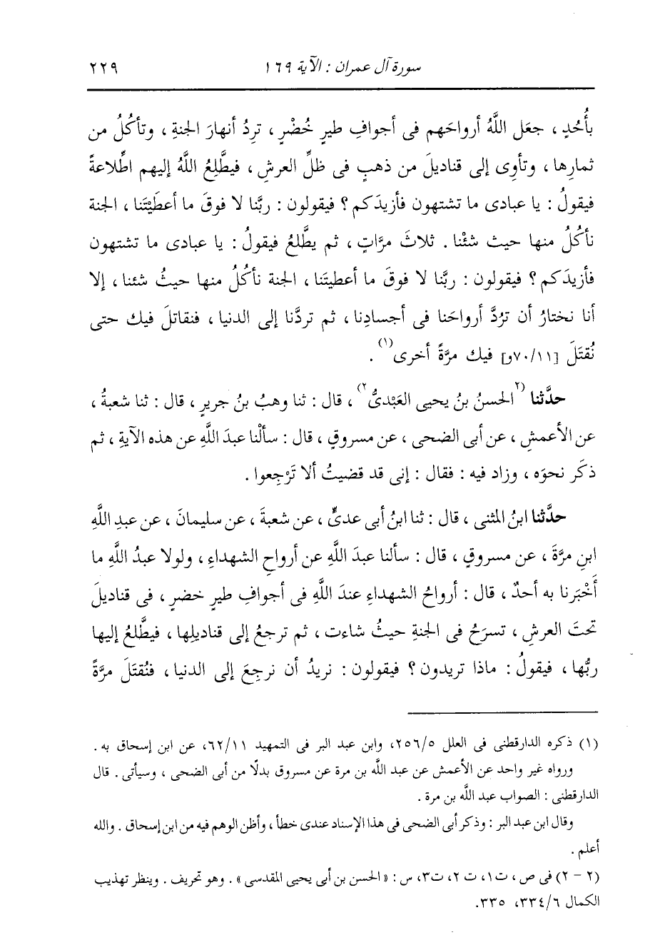 حَدَّثَنَا ابْنُ الْمُثَنَّى، قَالَ: ثنا ابْنُ أَبِي عَدِيٍّ، عَنْ شُعْبَةَ، عَنْ سُلَيْمَانَ، عَنْ عَبْدِ اللَّهِ بْنِ مُرَّةَ، عَنْ مَسْرُوقٍ، قَالَ: سَأَلْنَا عَبْدَ اللَّهِ عَنْ أَرْوَاحِ الشُّهَدَاءِ وَلَوْلَا عَبْدُ اللَّهِ مَا أَخْبَرَنَا بِهِ أَحَدٌ قَالَ: " §أَرْوَاحُ الشُّهَدَاءِ عِنْدَ اللَّهِ فِي أَجْوَافِ طَيْرٍ خُضْرٍ، فِي قَنَادِيلَ تَحْتَ الْعَرْشِ، تَسْرَحُ فِي الْجَنَّةِ حَيْثُ شَاءَتْ، ثُمَّ تَرْجِعُ إِلَى قَنَادِيلِهَا، فَيَطَّلِعُ إِلَيْهَا رَبُّهَا، فَيَقُولُ: مَاذَا تُرِيدُونَ؟ فَيَقُولُونَ: نُرِيدُ أَنْ نَرْجِعَ إِلَى الدُّنْيَا فَنُقْتَلَ مَرَّةً -[230]- أُخْرَى "