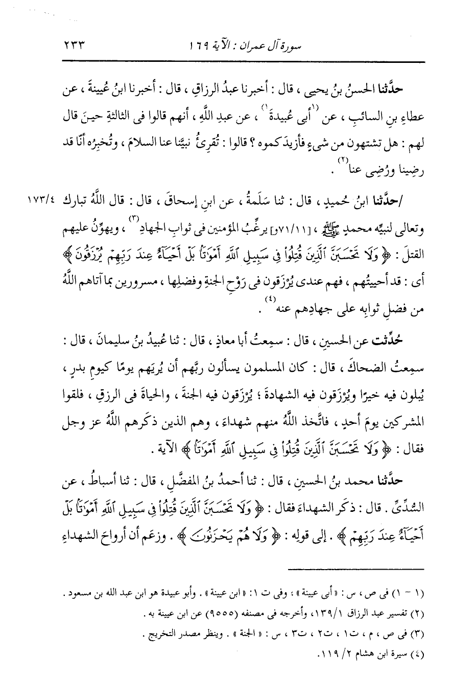 حَدَّثَنَا ابْنُ حُمَيْدٍ، قَالَ: ثنا سَلَمَةُ، عَنِ ابْنِ إِسْحَاقَ، قَالَ: «قَالَ اللَّهُ تَبَارَكَ وَتَعَالَى لِنَبِيِّهِ مُحَمَّدٍ صَلَّى اللهُ عَلَيْهِ وَسَلَّمَ يُرَغِّبُ الْمُؤْمِنِينَ فِي ثَوَابِ الْجَنَّةِ وَيُهَوِّنُ عَلَيْهِمُ الْقَتْلَ» : {§وَلَا تَحْسَبَنَّ الَّذِينَ قُتِلُوا فِي سَبِيلِ اللَّهِ أَمْوَاتًا بَلْ أَحْيَاءٌ عِنْدَ رَبِّهِمْ يُرْزَقُونَ} [آل عمران: 169] «أَيْ قَدْ أَحْيَيْتُهُمْ، فَهُمْ عِنْدِي يُرْزَقُونَ فِي رَوْحٍ الْجَنَّةِ وَفَضْلِهَا، مَسْرُورِينَ بِمَا آتَاهُمُ اللَّهُ مِنْ ثَوَابِهِ عَلَى جِهَادِهِمْ عَنْهُ»