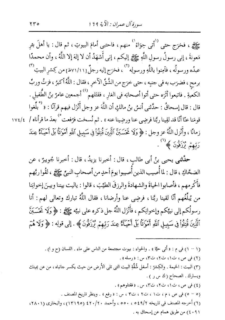 قَالَ: قَالَ إِسْحَاقُ: حَدَّثَنِي أَنَسُ بْنُ مَالِكٍ " أَنَّ اللَّهَ تَعَالَى أَنْزَلَ فِيهِمْ قُرْآنًا رُفِعَ بَعْدَ مَا قَرَأْنَاهُ زَمَانًا، وَأَنْزَلَ اللَّهُ: {§وَلَا تَحْسَبَنَّ الَّذِينَ قُتِلُوا فِي سَبِيلِ اللَّهِ أَمْوَاتًا بَلْ أَحْيَاءٌ عِنْدَ رَبِّهِمْ يُرْزَقُونَ} [آل عمران: 169] "