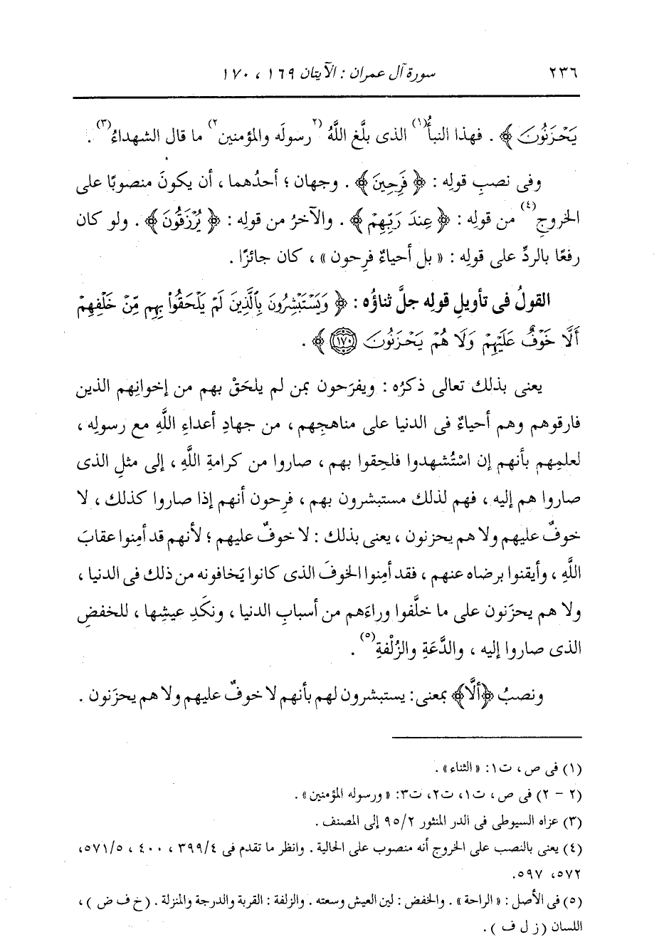 §الْقَوْلُ فِي تَأْوِيلِ قَوْلِهِ: {وَيَسْتَبْشِرُونَ بِالَّذِينَ لَمْ يَلْحَقُوا بِهِمْ مِنْ خَلْفِهِمْ أَلَّا خَوْفٌ عَلَيْهِمْ وَلَا هُمْ يَحْزَنُونَ} [آل عمران: 170] يَعْنِي بِذَلِكَ تَعَالَى ذِكْرُهُ: وَيَفْرَحُونَ بِمَنْ لَمْ يَلْحَقْ بِهِمْ مِنْ إِخْوَانِهِمُ الَّذِينَ فَارَقُوهُمْ وَهُمْ أَحْيَاءٌ فِي الدُّنْيَا عَلَى مَنَاهِجِهِمْ، مِنْ جِهَادِ أَعْدَاءِ اللَّهِ مَعَ رَسُولِهِ، لِعِلْمِهِمْ بِأَنَّهُمْ إِنِ اسْتُشْهِدُوا فَلَحِقُوا بِهِمْ، صَارُوا مِنْ كَرَامَةِ اللَّهِ إِلَى مِثْلِ الَّذِي صَارُوا هُمْ إِلَيْهِ، فَهُمْ لِذَلِكَ مُسْتَبْشِرُونَ بِهِمْ، فَرِحُونَ أَنَّهُمْ إِذَا صَارُوا كَذَلِكَ، {لَا خَوْفٌ عَلَيْهِمْ وَلَا هُمْ يَحْزَنُونَ} [يونس: 62] يَعْنِي بِذَلِكَ: لَا خَوْفٌ عَلَيْهِمْ؛ لِأَنَّهُمْ قَدْ آمَنُوا عِقَابَ اللَّهِ، وَأَيْقَنُوا بِرِضَاهَ عَنْهُمْ، فَقَدْ آمَنُوا الْخَوْفَ الَّذِي كَانُوا يَخَافُونَهُ مِنْ ذَلِكَ فِي الدُّنْيَا، وَلَا هُمْ يَحْزَنُونَ عَلَى مَا خَلَّفُوا وَرَاءَهُمْ مِنْ أَسْبَابِ الدُّنْيَا، وَنَكَدِ عَيْشِهَا، لِلْخَفْضِ الَّذِي صَارُوا إِلَيْهِ وَالدَّعَةِ وَالزُّلْفَةِ، وَنَصَبَ أَنْ لَا بِمَعْنَى: يَسْتَبْشِرُونَ لَهُمْ بِأَنَّهُمْ لَا خَوْفٌ عَلَيْهِمْ وَلَا هُمْ يَحْزَنُونَ.