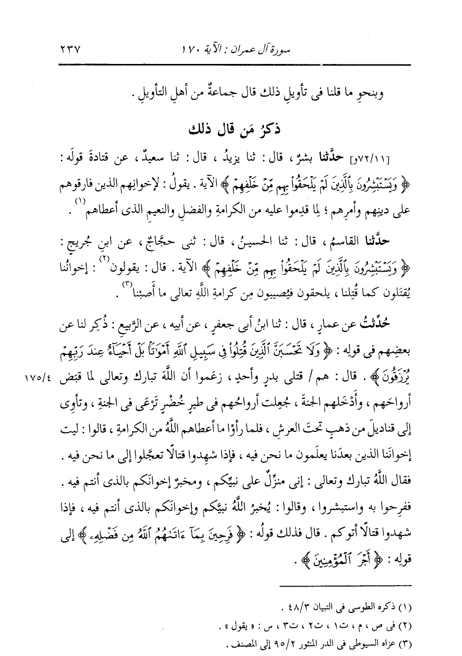 حُدِّثْتُ عَنْ عَمَّارٍ، قَالَ: ثنا ابْنُ أَبِي جَعْفَرٍ، عَنْ أَبِيهِ، عَنِ الرَّبِيعِ: ذُكِرَ لَنَا عَنْ بَعْضِهِمْ، فِي قَوْلِهِ: {§وَلَا تَحْسَبَنَّ الَّذِينَ قُتِلُوا فِي سَبِيلِ اللَّهِ أَمْوَاتًا بَلْ أَحْيَاءٌ عِنْدَ رَبِّهِمْ يُرْزَقُونَ} [آل عمران: 169] قَالَ: " هُمْ قَتْلَى بَدْرٍ وَأُحُدٍ، زَعَمُوا أَنَّ اللَّهَ تَبَارَكَ وَتَعَالَى لَمَّا قَبَضَ أَرْوَاحَهُمْ، وَأُدْخَلَهُمُ الْجَنَّةَ، جُعِلَتْ أَرْوَاحُهُمْ فِي طَيْرٍ خُضْرٍ تَرْعَى فِي الْجَنَّةِ، وَتَأْوِي إِلَى قَنَادِيلَ مِنْ ذَهَبٍ تَحْتَ الْعَرْشِ، فَلَمَّا رَأَوْا مَا أَعْطَاهُمُ اللَّهُ مِنَ الْكَرَامَةِ، قَالُوا: لَيْتَ إِخْوَانَنَا الَّذِينَ بَعْدَنَا يَعْلَمُونَ مَا نَحْنُ فِيهِ، فَإِذَا شَهِدُوا قِتَالًا تَعَجَّلُوا إِلَى مَا نَحْنُ فِيهِ، فَقَالَ اللَّهُ تَعَالَى: إِنِّي مَنْزِلٌ عَلَى نَبِيِّكُمْ وُمُخْبِرٌ إِخْوَانَكُمْ بِالَّذِي أَنْتُمْ فِيهِ، فَفَرِحُوا بِهِ وَاسْتَبْشَرُوا، وَقَالُوا: يُخْبِرُ اللَّهُ نَبِيَّكُمْ وَإِخْوَانَكُمْ بِالَّذِي أَنْتُمْ فِيهِ، فَإِذَا شَهِدُوا قِتَالًا أَتَوْكُمْ " قَالَ: فَذَلِكَ قَوْلُهُ: {فَرِحِينَ بِمَا آتَاهُمُ اللَّهُ مِنْ فَضْلِهِ} [آل عمران: 170] إِلَى قَوْلِهِ: {أَجْرَ الْمُؤْمِنِينَ} [آل عمران: 171]