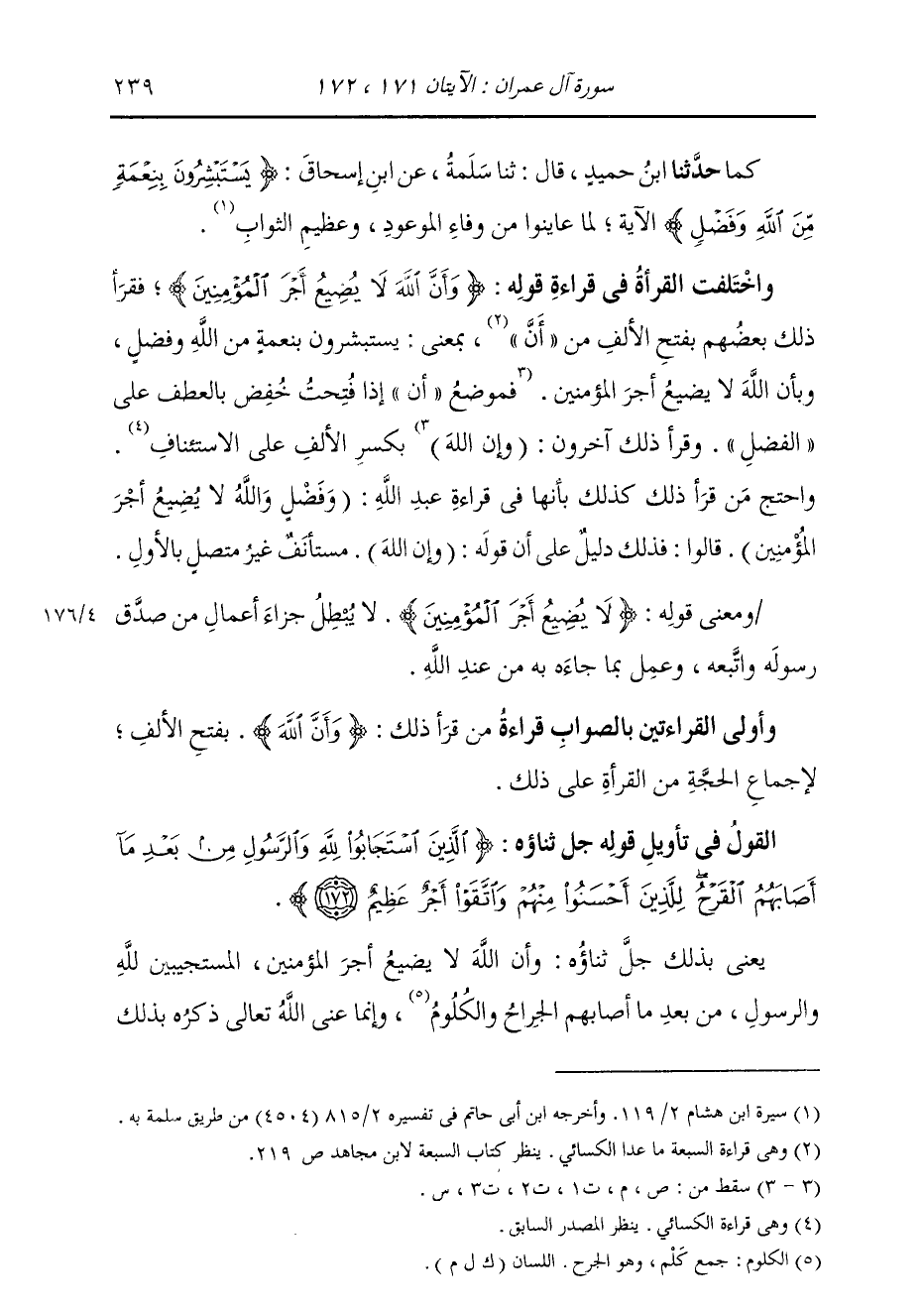 كَمَا: حَدَّثَنَا ابْنُ حُمَيْدٍ، قَالَ: ثنا سَلَمَةُ، عَنْ أَبِي إِسْحَاقَ: {§يَسْتَبْشِرُونَ بِنِعْمَةٍ مِنَ اللَّهِ وَفَضْلٍ} [آل عمران: 171] الْآيَةَ، «لِمَا عَايَنُوا مِنْ وَفَاءِ الْمَوْعُودِ وَعَظِيمِ الثَّوَابِ» وَاخْتَلَفَ الْقُرَّاءُ فِي قِرَاءَةِ قَوْلِهِ {وَأَنَّ اللَّهَ لَا يُضِيعُ أَجْرَ الْمُؤْمِنِينَ} [آل عمران: 171] ، فَقَرَأَ ذَلِكَ بَعْضُهُمْ بِفَتْحِ الْأَلْفِ مِنْ «أَنَّ» بِمَعْنَى يَسْتَبْشِرُونَ بِنِعْمَةٍ مِنَ اللَّهِ وَفَضْلٍ، وَبِأَنَّ اللَّهَ لَا يُضِيعُ أَجْرَ الْمُؤْمِنِينَ، وَبِكَسْرِ الْأَلْفِ عَلَى الِاسْتِئْنَافِ؛ وَاحْتَجَّ مَنْ قَرَأَ ذَلِكَ كَذَلِكَ بِأَنَّهَا فِي قِرَاءَةِ عَبْدِ اللَّهِ: «وَفَضْلٍ، وَاللَّهُ لَا يُضِيعُ أَجْرَ الْمُؤْمِنِينَ» قَالُوا: فَذَلِكَ دَلِيلٌ عَلَى أَنَّ قَوْلَهُ: {وَأَنَّ اللَّهَ} [آل عمران: 171] مُسْتَأْنَفٌ غَيْرُ مُتَّصِلٍ بِالْأَوَّلِ. وَمَعْنَى قَوْلِهِ: {لَا يُضِيعُ أَجْرَ الْمُؤْمِنِينَ} [آل عمران: 171] لَا يُبْطِلُ جَزَاءَ أَعْمَالِ مَنْ صَدَّقَ رَسُولَهُ وَاتَّبَعَهُ وَعَمِلَ بِمَا جَاءَهُ مِنْ عِنْدِ اللَّهِ. وَأَوْلَى الْقِرَاءَتَيْنِ بِالصَّوَابِ قِرَاءَةُ مَنْ قَرَأَ ذَلِكَ: {وَأَنَّ اللَّهَ} [آل عمران: 171] بِفَتْحِ الْأَلْفِ، لِإِجْمَاعِ الْحُجَّةِ مِنَ الْقُرَّاءِ عَلَى ذَلِكَ