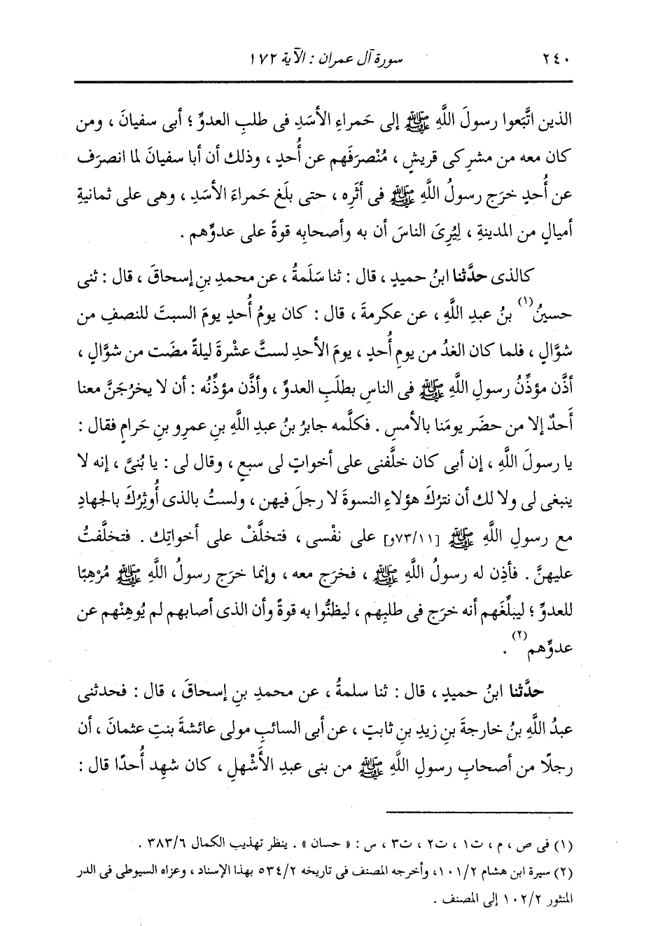 كَالَّذِي حَدَّثَنَا ابْنُ حُمَيْدٍ، قَالَ ثنا سَلَمَةُ، عَنْ مُحَمَّدِ بْنِ إِسْحَاقَ، قَالَ: ثني حَسَّانُ بْنُ عَبْدِ اللَّهِ، عَنْ عِكْرِمَةَ، قَالَ: كَانَ يَوْمُ أُحُدٍ السَّبْتَ لِلنِّصْفِ مِنْ شَوَّالٍ؛ فَلَمَّا كَانَ الْغَدُ مِنْ يَوْمِ أُحُدٍ، يَوْمَ الْأَحَدِ لَسْتَ عَشْرَةَ لَيْلَةً مَضَتْ مِنْ شَوَّالٍ أَذَّنَ مُؤَذِّنُ رَسُولِ اللَّهِ صَلَّى اللهُ عَلَيْهِ وَسَلَّمَ فِي النَّاسِ بِطَلَبِ الْعَدُوِّ، وَأَذَّنَ مُؤَذِّنُهُ أَنْ لَا يَخْرُجَنَّ مَعَنَا أَحَدٌ إِلَّا مَنْ حَضَرَ يَوْمَنَا بِالْأَمْسِ، فَكَلَّمَهُ جَابِرُ بْنُ عَبْدِ اللَّهِ بْنِ عَمْرِو بْنِ حَرَامٍ، فَقَالَ: يَا رَسُولَ اللَّهِ إِنَّ أَبِي كَانَ خَلَّفَنِي عَلَى أَخَوَاتٍ لِي سَبْعٍ وَقَالَ لِي: يَا بُنَيَّ إِنَّهُ لَا يَنْبَغِي لِي وَلَا لَكَ أَنْ نَتْرُكَ هَؤُلَاءِ النِّسْوَةَ لَا رَجُلَ فِيهِنَّ، وَلَسْتُ بِالَّذِي أُوثِرُكَ بِالْجِهَادِ مَعَ رَسُولِ اللَّهِ صَلَّى اللهُ عَلَيْهِ وَسَلَّمَ عَلَى نَفْسِي، فَتَخَلَّفْ عَلَى أَخَوَاتِكِ، فَتَخَلَّفْتُ عَلَيْهِنَّ، فَأَذِنَ لَهُ رَسُولُ اللَّهِ صَلَّى اللهُ عَلَيْهِ وَسَلَّمَ، فَخَرَجَ مَعَهُ. وَإِنَّمَا §خَرَجَ رَسُولُ اللَّهِ صَلَّى اللهُ عَلَيْهِ وَسَلَّمَ مُرْهِبًا لِلْعَدُوٍّ، لِيُبَلِّغَهُمْ أَنَّهُ خَرَجَ فِي طَلَبِهِمْ لِيَظُنُّوا بِهِ قُوَّةً، وَأَنَّ الَّذِي أَصَابَهُمْ لَمْ يُوَهِّهِمْ عَنْ عَدُوِّهِمْ "