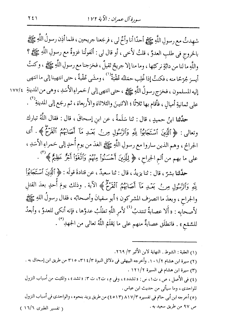 حَدَّثَنَا ابْنُ حُمَيْدٍ، قَالَ: ثنا سَلَمَةُ، عَنِ ابْنِ إِسْحَاقَ، قَالَ: فَقَالَ اللَّهُ تَبَارَكَ وَتَعَالَى: {§الَّذِينَ اسْتَجَابُوا لِلَّهِ وَالرَّسُولِ مِنْ بَعْدِ مَا أَصَابَهُمُ الْقَرْحُ} [آل عمران: 172] «أَيِ الْجِرَاحُ، وَهُمُ الَّذِينَ سَارُوا مَعَ رَسُولِ اللَّهِ صَلَّى اللهُ عَلَيْهِ وَسَلَّمَ الْغَدَ مِنْ يَوْمِ أُحُدٍ إِلَى حَمْرَاءِ الْأَسَدِ عَلَى مَا بِهِمْ مِنْ أَلَمِ الْجِرَاحِ» {لِلَّذِينَ أَحْسَنُوا مِنْهُمْ وَاتَّقَوْا أَجْرٌ عَظِيمٌ} [آل عمران: 172]