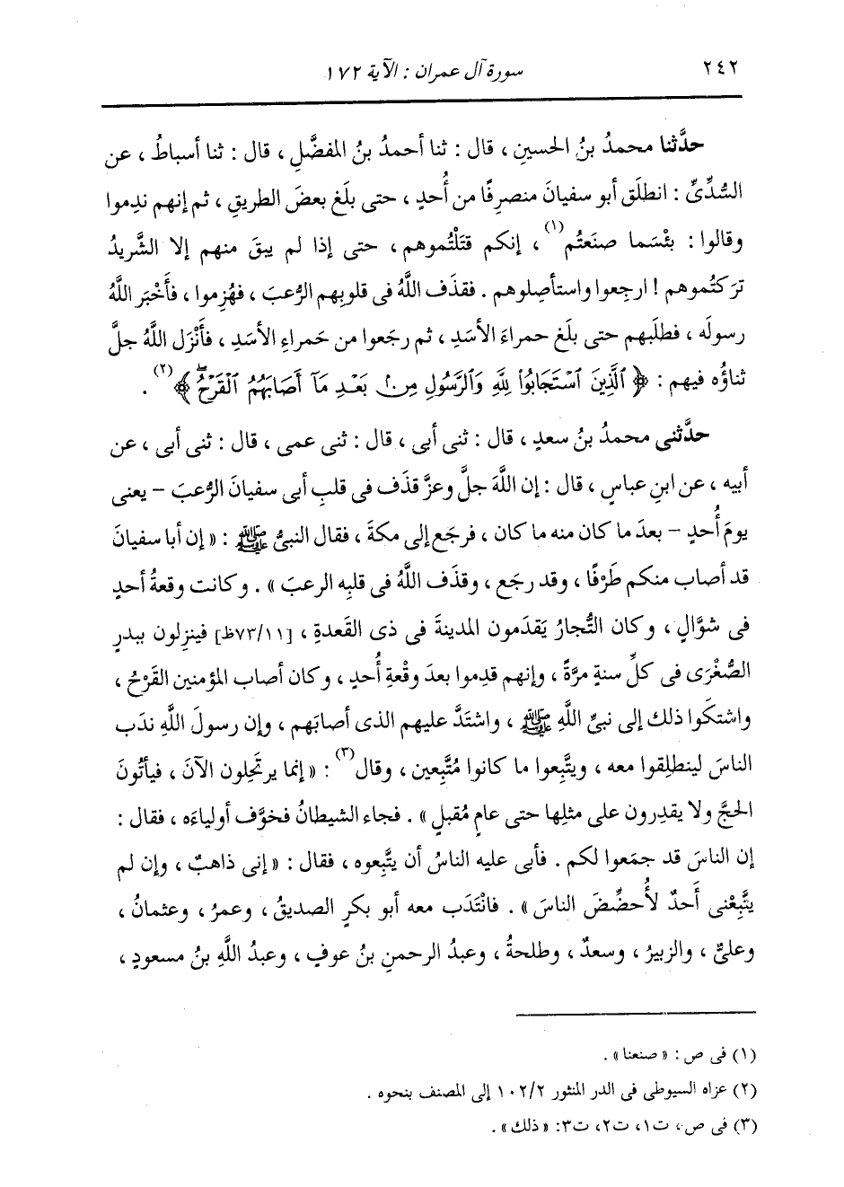 حَدَّثَنَا مُحَمَّدُ بْنُ الْحُسَيْنِ، قَالَ: ثنا أَحْمَدُ بْنُ الْمُفَضَّلِ، قَالَ: ثنا أَسْبَاطٌ، عَنِ السُّدِّيِّ: " انْطَلَقَ أَبُو سُفْيَانَ مُنْصَرِفًا مِنْ أُحُدٍ حَتَّى بَلَغَ بَعْضَ الطَّرِيقِ، ثُمَّ إِنَّهُمْ نَدِمُوا، وَقَالُوا: بِئْسَمَا صَنَعْتُمْ إِنَّكُمْ قَتَلْتُمُوهُمْ، حَتَّى إِذَا لَمْ يَبْقَ إِلَّا الشَّرِيدُ تَرَكْتُمُوهُمْ، ارْجِعُوا وَاسْتَأْصِلُوهُمْ، §فَقَذَفَ اللَّهُ فِي قُلُوبِهِمُ الرُّعْبَ، فَهُزِمُوا. فَأَخْبَرَ اللَّهُ رَسُولَهُ، فَطَلَبَهُمْ حَتَّى بَلَغَ حَمْرَاءَ الْأَسَدِ، ثُمَّ رَجَعُوا مِنْ حَمْرَاءِ الْأَسَدِ، فَأَنْزَلَ اللَّهُ جَلَّ ثناؤُهُ فِيهِمْ ": {الَّذِينَ اسْتَجَابُوا لِلَّهِ وَالرَّسُولِ مِنْ بَعْدِ مَا أَصَابَهُمُ الْقَرْحُ} [آل عمران: 172]
